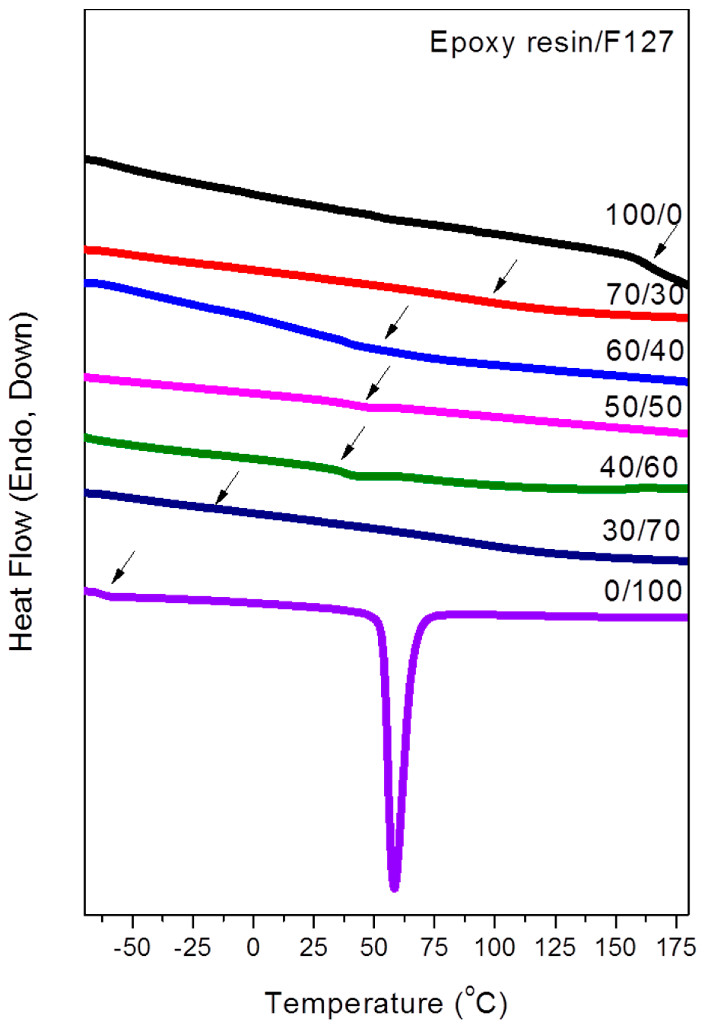 Differential scanning calorimetry (DSC) thermograms of epoxy resin/F127 blends of various compositions (second run; heating rate: 20 °C/min).