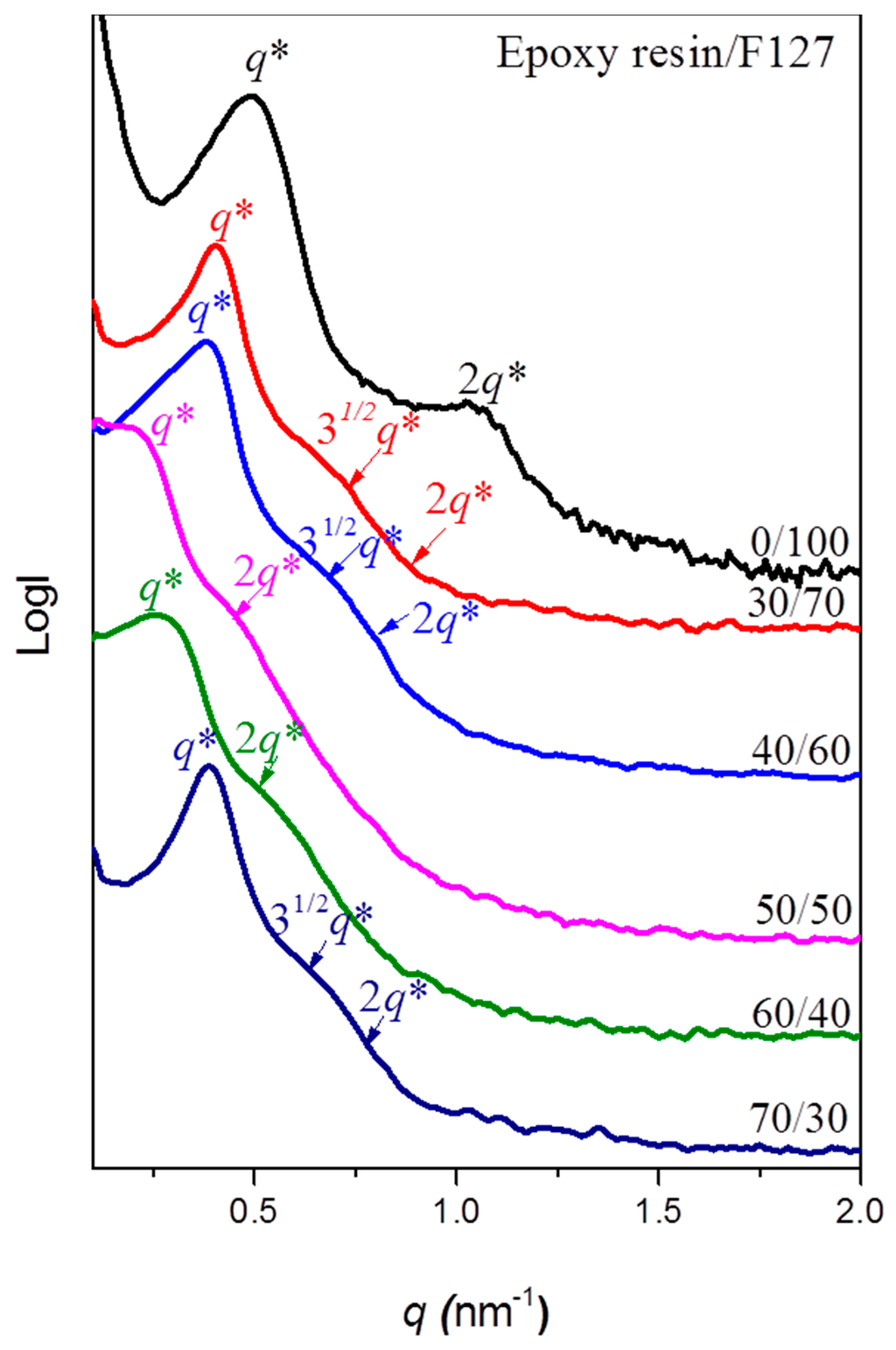 Small-angle X-ray scattering (SAXS) patterns of epoxy/F127 blends cured at weight fractions of F127 of 30, 40, 50, 60 and 70 wt %.