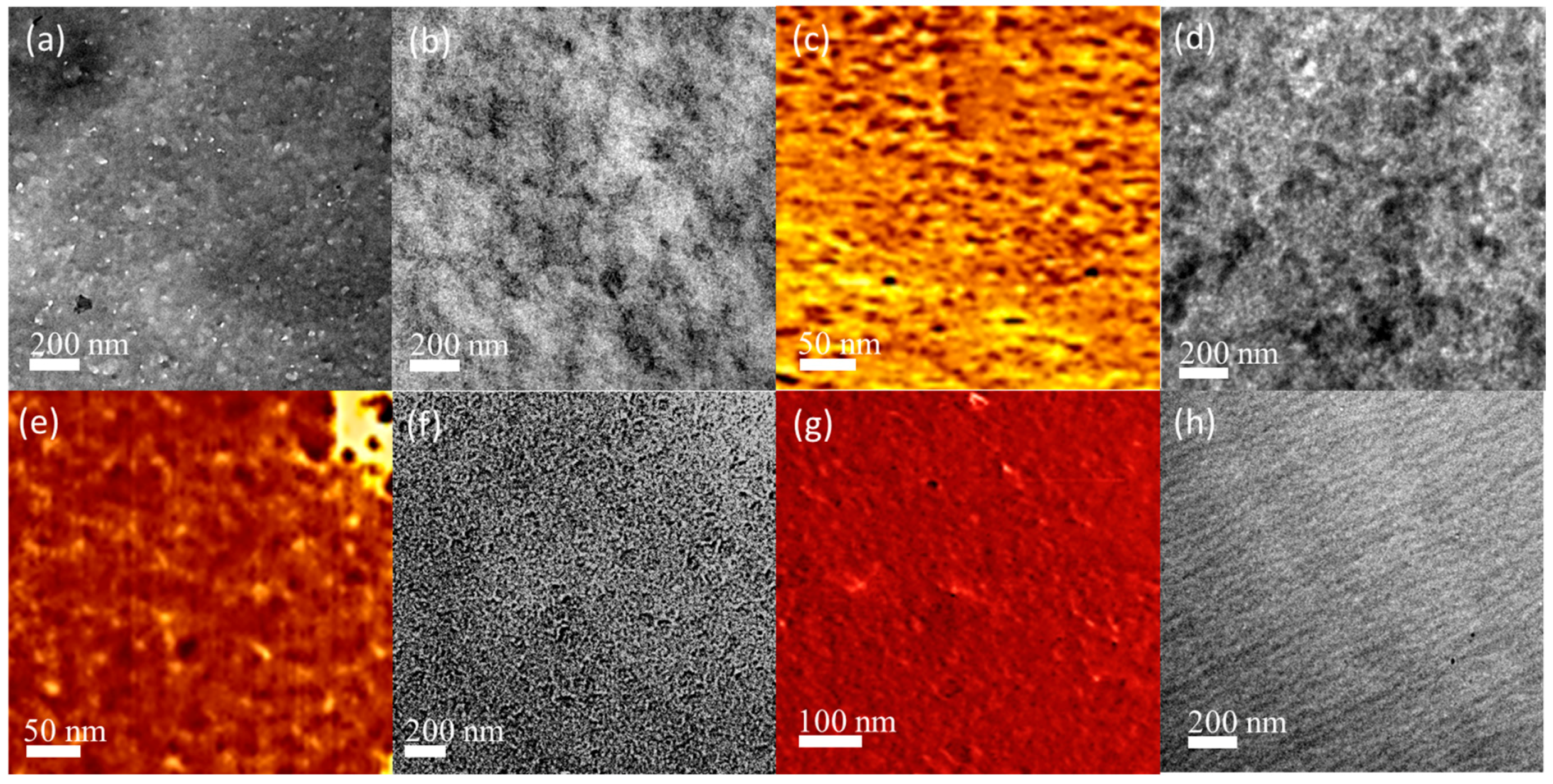 (a) Transmission electron microscopy (TEM) images of epoxy/F127 = 70/30; (b) TEM images of epoxy/F127 = 60/40; (c) AFM images of epoxy/F127 = 60/40; (d) TEM images of epoxy/F127 = 50/50; (e) AFM images of epoxy/F127 = 50/50; (f) TEM images of epoxy/F127 = 40/60; (g) AFM images of Epoxy/F127 = 40/60; (h) TEM images of epoxy/F127 = 30/70.