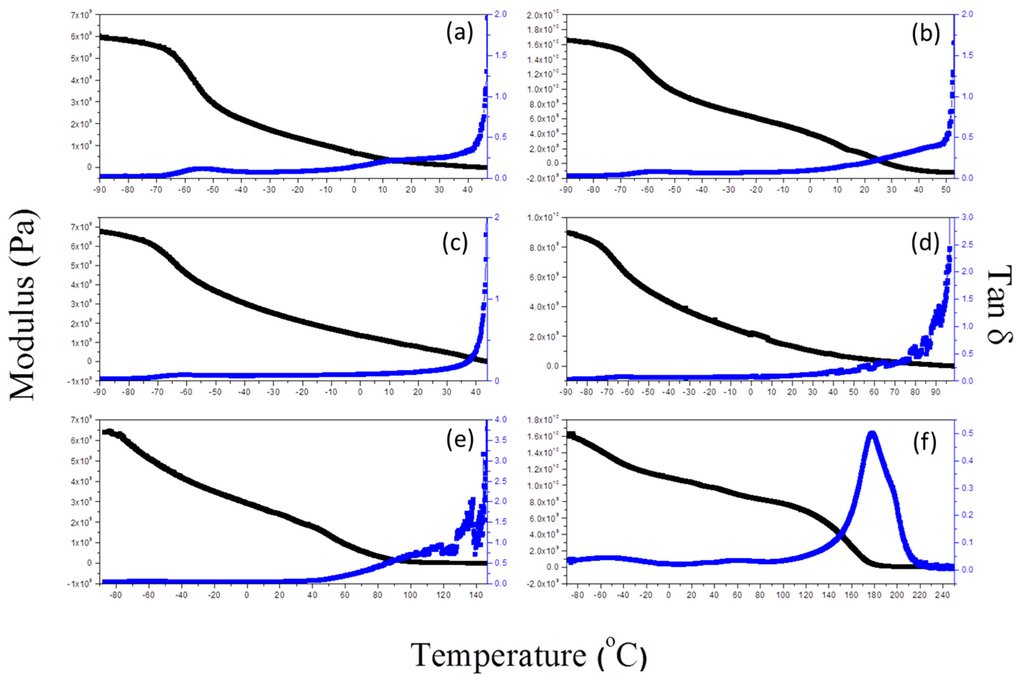 Dynamic mechanical analysis (DMA) of epoxy/F127 blends cured at weight fractions of (a) 30; (b) 40; (c) 50; (d) 60; (e) 70 and (f) 100 wt %.