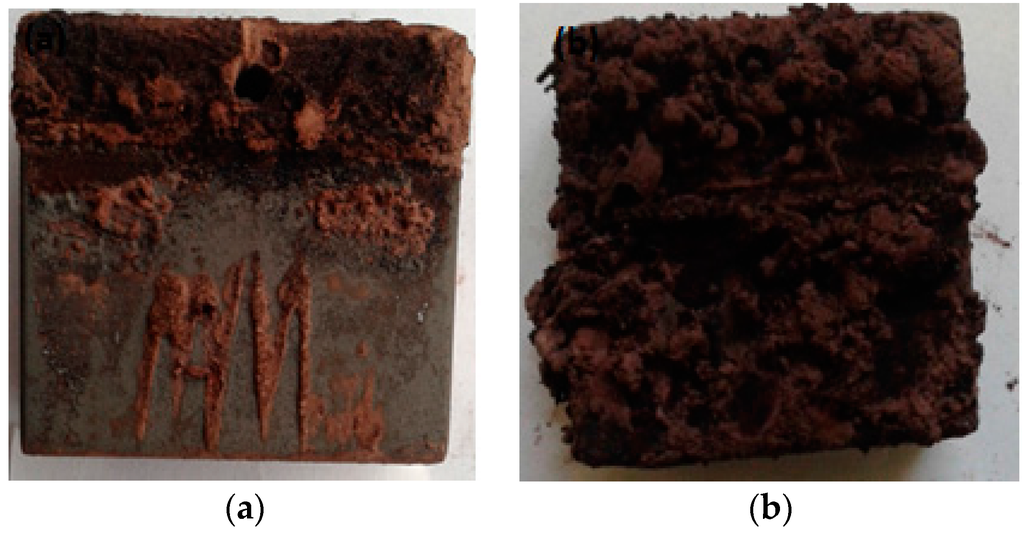 Figure 5 shows the visual appearance of MAS samples after 60 days of exposure to E80 with and without chloride. In Figure 5b, more rust is seen on MAS after immersion tests in E80 with 32 mg/L chloride, in comparison with the appearance of MAS in Figure 5a. The increase in rust is caused by a substantial increase in oxygen solubility due to the presence of chloride [24].