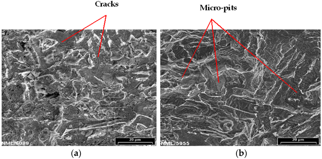 Figure 6a shows the scanning electron microscope (SEM) image of the morphology of MAS after cleaning of corrosion products from samples immersed in E80 without chloride for 60 days. Micro-cracks are visible, as indicated with red arrows. In the presence of 32 mg/L NaCl (Figure 6b), micro-pits were formed on the surface of the material. The pitting attack is small at the surface and was not discovered by visual examination since corrosion products covered the samples [25]. The presence of micro-pits is ascribed to the action of Cl− ions in the breakdown of passive surface films formed on MAS in E80, as no pitting was noticed on the samples tested in the absence of chloride. The growth of these pits may lead to perforation and eventually bring about stress corrosion cracking, thereby decreasing the lifespan of MAS. Furthermore, pitting corrosion on MAS in the presence of chloride as observed in this study is in agreement with results of published literatures on the role of chloride in the ethanol corrosion of steel [1,5,17].