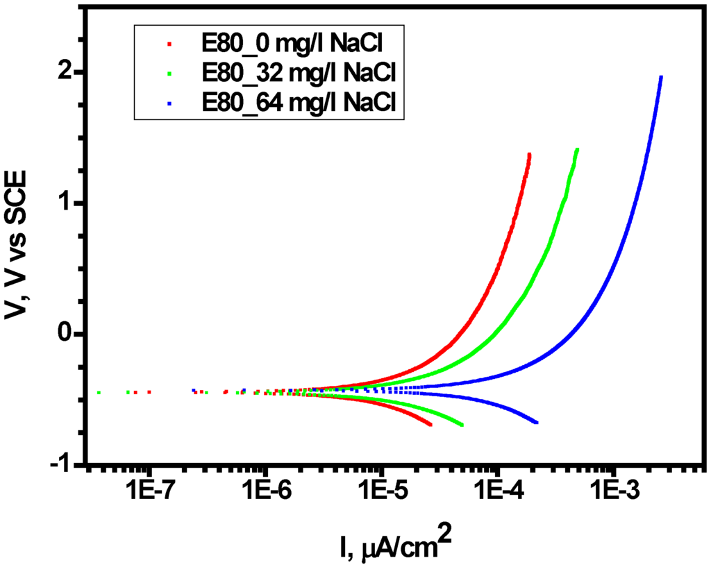 Effect of chloride on anodic polarization of MAS showing increase in current density with increasing chloride in E80.