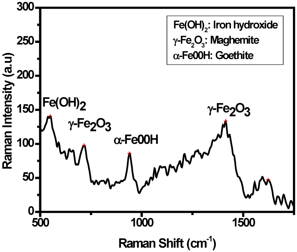 - Hanesch, M. Raman spectroscopy of iron oxides and (oxy)hydroxides at low laser power and possible applications in environmental magnetic studies. Int. J. Geophys. 2009, 177, 941–948. [Google Scholar] [CrossRef]