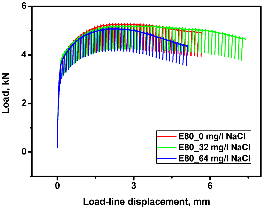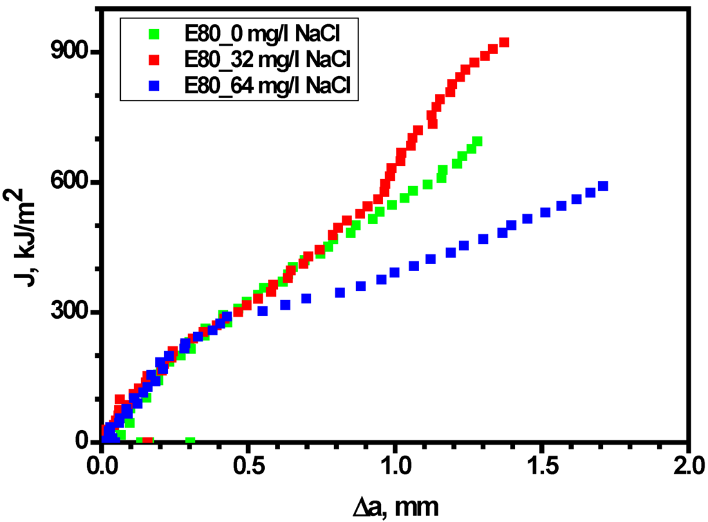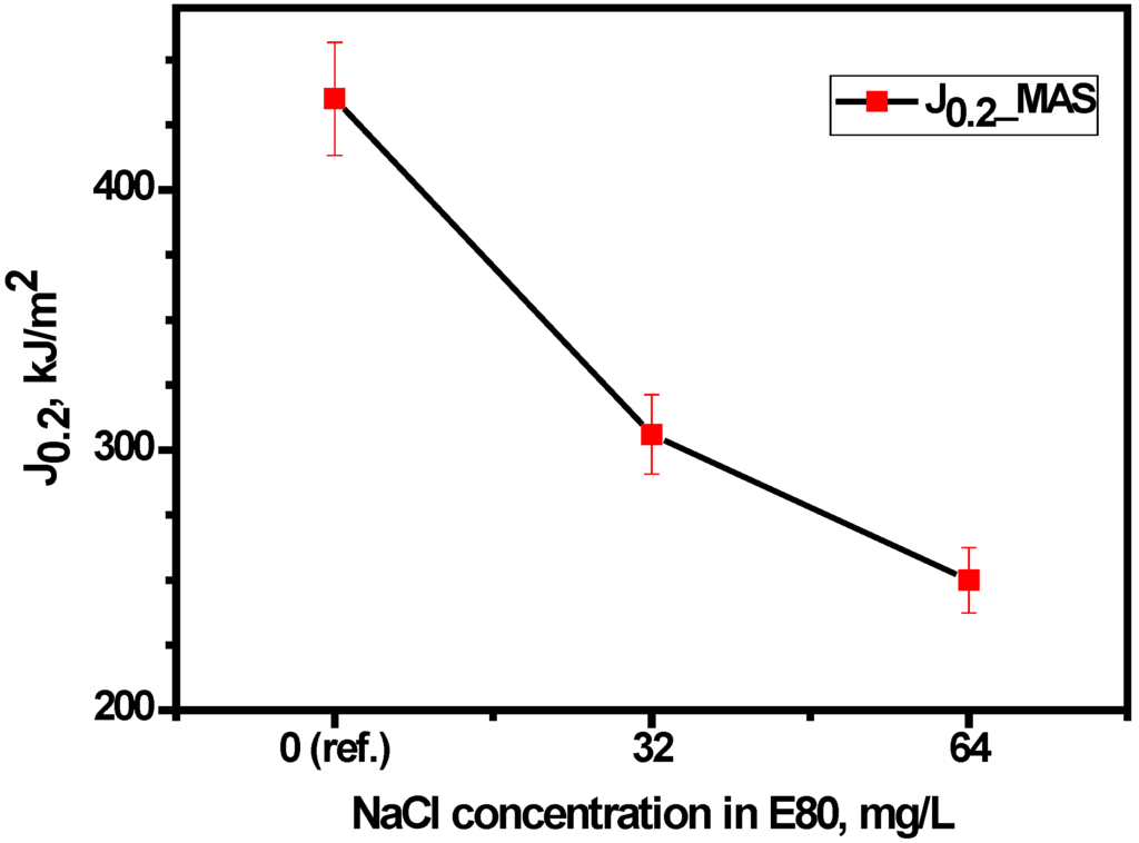 Fracture tests carried out in the presence and absence of chloride revealed close a similarity in the J-R curves of MAS in E80 with 0 and 32 mg/L NaCl, respectively (as shown in Figure 10). On the other hand, the J-R behavior of MAS was slightly altered by a decrease in the J-R curve after the crack initiation in the presence of 64 mg/L NaCl. However, it is more suitable to base evaluations on the critical fracture toughness of the specimens, as reported in the literature [29].