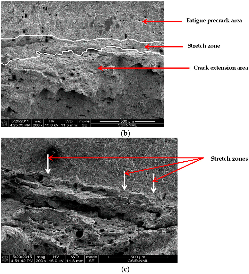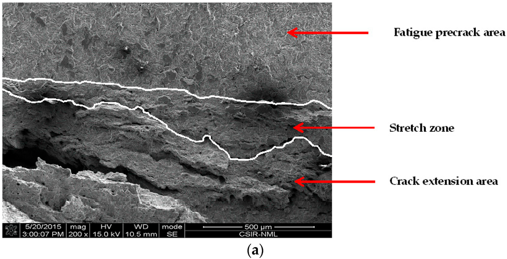 From a fracture mechanics point of view, the decrease in fracture toughness can be said to originate from the blunting behavior of cracks in MAS upon loading. Crack extension by void coalescence is preceded by the expanse of stretch zone, which is a featureless region immediately after the fatigue pre-crack region. The stretch zone is essentially described as an imprint of the initiation fracture regime of ductile materials, and thus has a correlation with the initiation fracture toughness of a material [30,31]. Numerous attempts have been made to measure stretch zone dimensions and acquire a suitable correlation with ductile fracture toughness [30,31,32,33]. Two stretch zone components are typically associated with extremely ductile materials, namely stretch zone width (SZW) and stretch zone depth (SZD). However, there is no agreement as regards which of the stretch zone measurements ought to be used for defining critical fracture toughness. Consequently, SZW is used for this study.