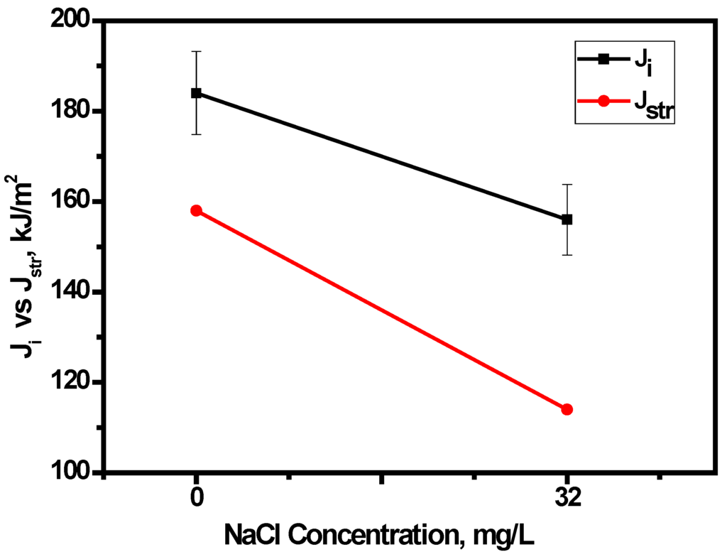 In addition, the micron marker on the SEM image was measured in mm, and the number of microns corresponding to 1 mm was calculated. The measured SZW in mm was converted to microns and the fracture initiation toughness was evaluated from the J-R curves by the vertical intercept at . The initiation fracture toughness determined from the SZW is denoted as Jstr and is plotted as a function of chloride concentration in Figure 14.