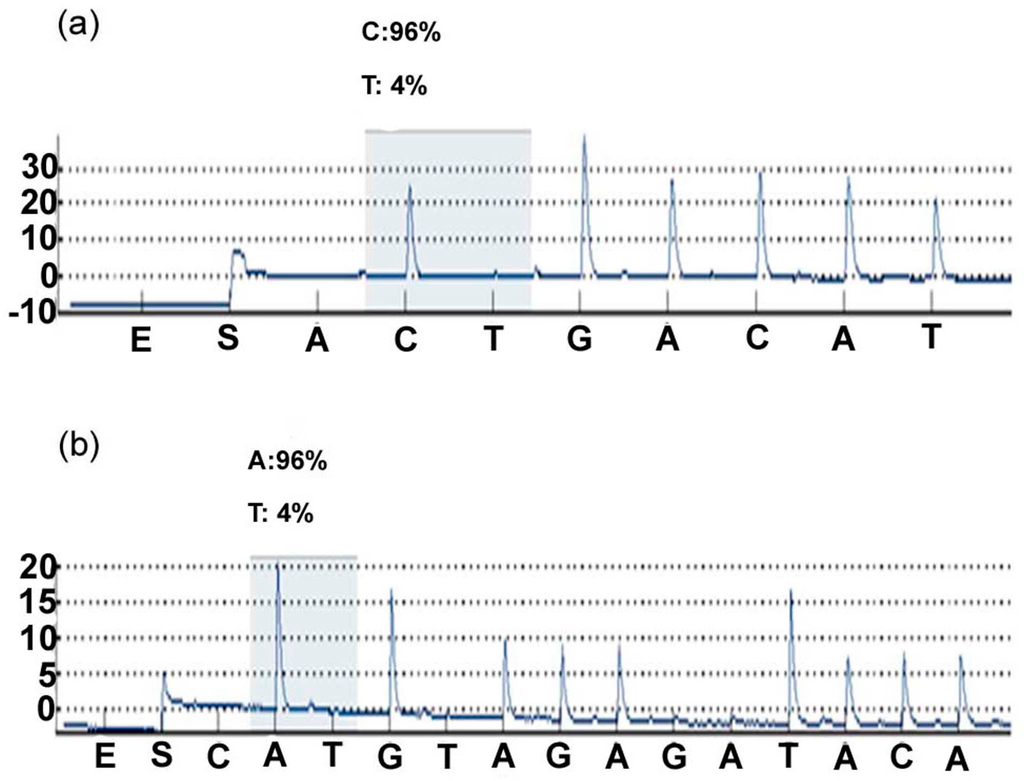 EGFR and FGFR2 mutations were validated by pyrosequencing of cSCC specimens. (a) EGFR g. 55249110 G > A (b) FGFR2 g. 123274818 T > A. Both (a,b) are reverse sequences.