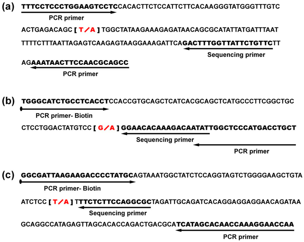 Specific primers for KDR, EGFR, and FGFR2 were used in this study: (a) primers for KDR mutation; (b) primers for mutation variant; (c) primers for FGFR2 mutation.