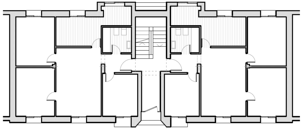 The case study is a typical apartment block, very common in the European scenario and a scheme widely used for social housing in the last century. The building is a three-storey case (maximum height allowed in social housing in Spain that does not require the introduction of an elevator) and a typical distribution of two apartments per floor (see Figure 1), balancing the use of the common space versus housing spaces. Surface area per floor is 147.83 m2, so the total built area of the building is 443.49 m2, with a total of six houses.