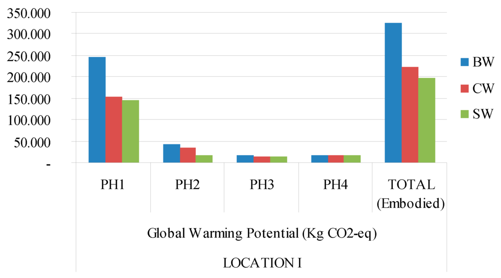 Global Warming Potential (GWP) 100a (Kg eq-CO2) for each type of building construction system and Mediterranean climate (location 1). PH1: manufacturing; PH2: constructing−demolishing; PH3: transport; PH4: final disposal. BW: ceramic brick walls; CB: concrete block walls; SW: stabilized soil walls.