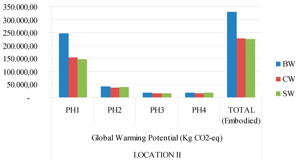 GWP 100a (Kg eq-CO2) for each type of building construction system and continental climate (location 2). PH1: manufacturing; PH2: constructing−demolishing; PH3: transport; PH4: final disposal. BW: ceramic brick walls; CB: concrete block walls; SW: stabilized soil walls.