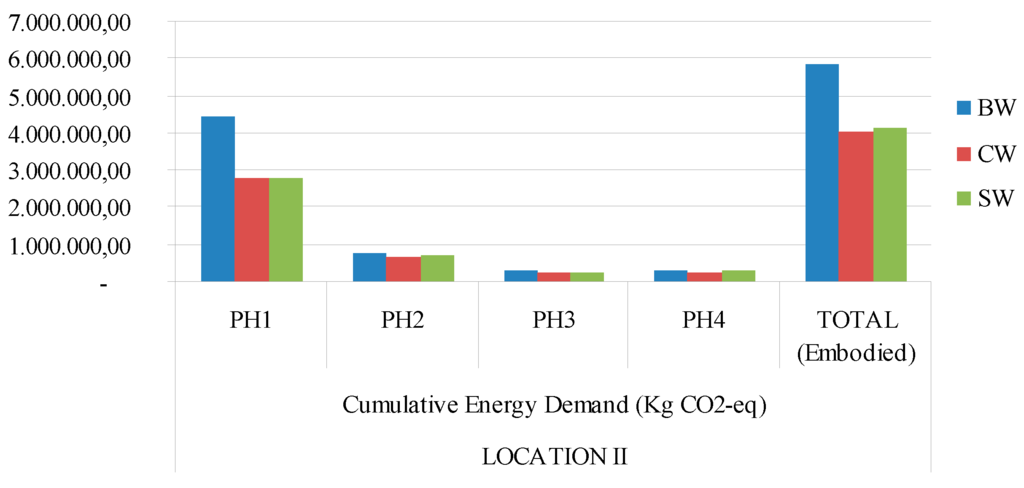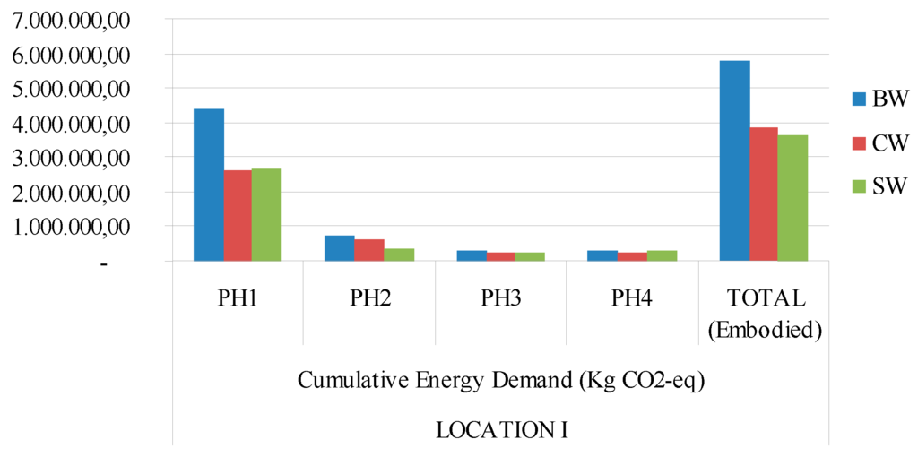 If different phases are compared, both CO2 emissions and cumulative energy demand, the greatest differences among both climates takes place in PH2. Analyzing Table 5, consumption data per m2 and year, they show remarkable differences between SW and BW values of total embodied energy. CO2 emissions for BW rise up to 1.6 times higher in cold climates. For warm climates, BW exceeds 1.5 times the values of SW.