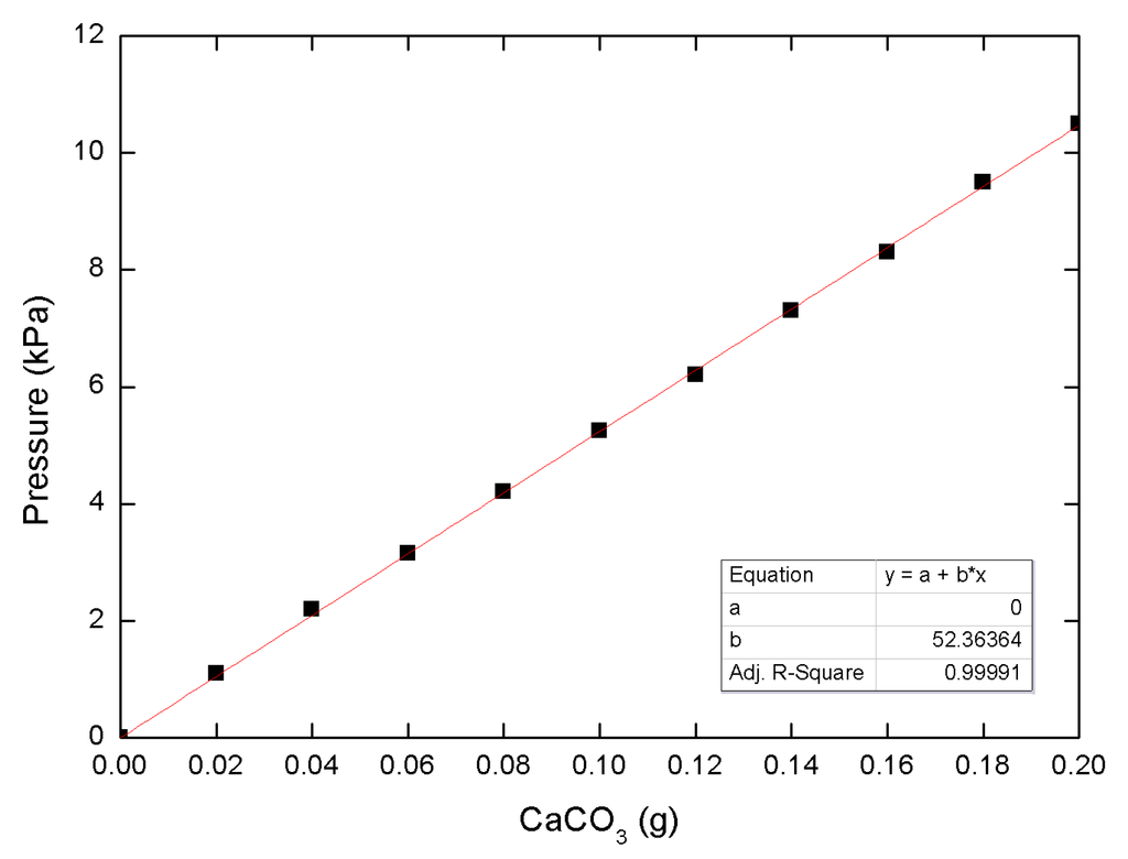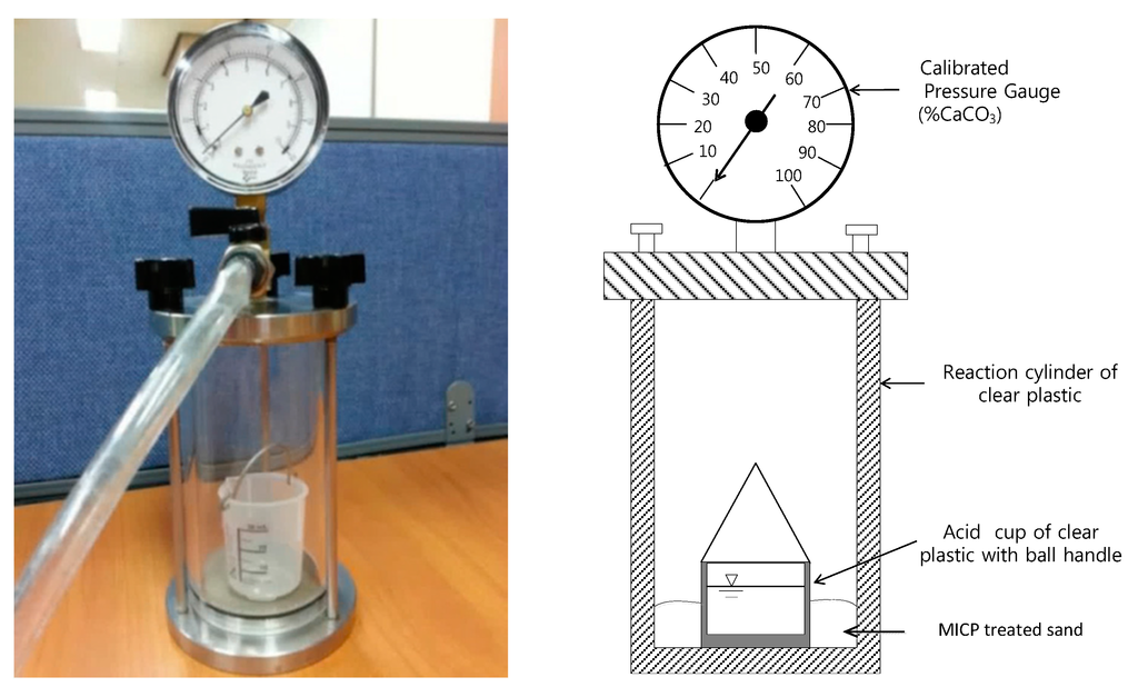 The amount of calcium carbonate precipitation was measured using ASTM D4373 [29]. This standard method utilizes a reaction cylinder, a cup filled with hydrochloric acid (HCl), and pressure gauge (see Figure 3). Briefly, the sand sample was poured into the reaction cylinder and a cup filled with HCl was placed in the cylinder. The reaction cylinder was closed tight to prevent gas leakage, and was tilted so that the acid reacted with the treated sand. Carbon dioxide (CO2) was produced in the cylinder in the course of a chemical reaction between the calcium carbonate sand deposit and HCl. Gas (CO2) pressure was related to the amount of calcium carbonate using a calibration curve. The calibration curve was created using 20 mL 1 N HCl (80 mL HCl in 720 mL distilled water) and different amounts of calcium carbonate (0.2 g, 0.4 g, 0.6 g, 0.8 g, and 1.0 g) (CaCO3: Showa Chemicals Inc., Tokyo, Japan). The resulting curve is presented in Figure 4. Further details of the standard method can be found in ASTM D4373 [29].