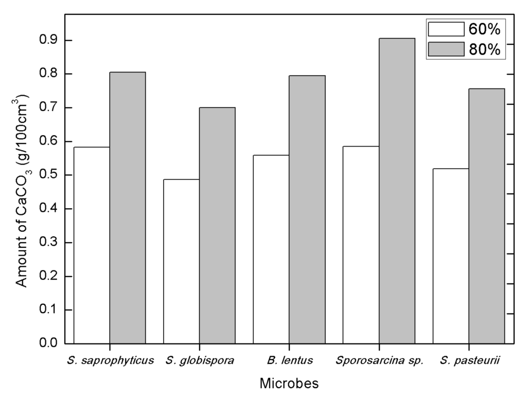 - The amount of calcium carbonate precipitation was greatest for Sporosarcina sp., followed by S. saprophyticus, B. lentus, S. pasteurii, and S. globispora. The difference between the greatest and smallest was about 17% and 23% for 60% and 80% relative density soil, respectively.
