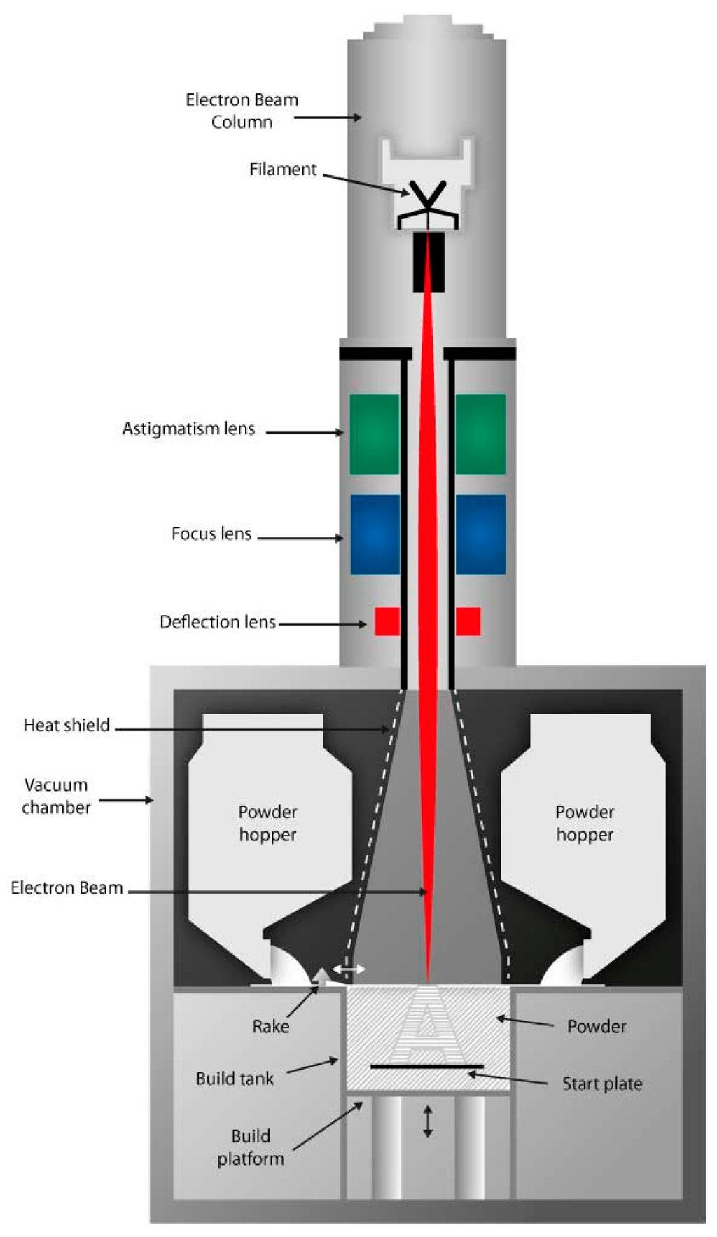 One method of ALM is electron beam melting (EBM), a technique in which the power from a high intensity tungsten filament sourced electron beam melts a pre alloyed metal powder upon a powder bed to a pre-programmed design. Components are built up layer by layer within a near-vacuum environment, from a powder feedstock supplied from hoppers adjacent to the build chamber as given in Figure 1 [4]. The EBM process consists of the following four stage procedure: