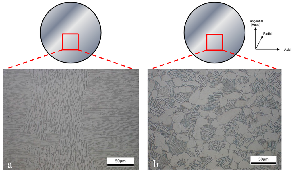 Microstructure of (a) Cast and HIP Ti-6Al-4V and (b) Forged Ti-6Al-4V small punch disc specimens prior to testing, illustrating the top surface of the SP specimen where the punch makes initial contact.