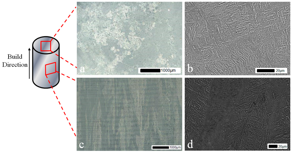 Microstructure of EBM Ti-6Al-4V (a) perpendicular to the build direction at low magnification; (b) perpendicular to the build direction at high magnification; (c) parallel to the build direction at low magnification and (d) parallel to the build direction at high magnification. Load is applied through the face perpendicular to the build direction.