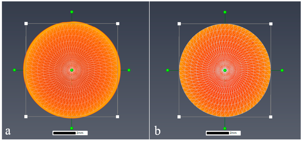 Image showing a volume render of the small punch specimen both (a) before and (b) after trimming in Avizo 9.0.