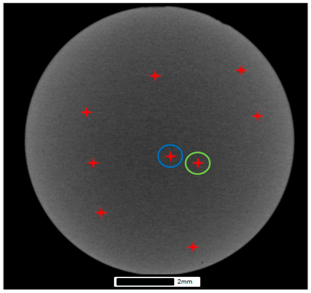 Feature characterisation was conducted using micro-CT with the combined use of Avizo 9.0 3D analysis software (Hillsboro, OR, USA) and VG Studio MAX 2.1 (Heidelberg, Germany). The post scan analysis was undertaken to characterise the porosity and revealed the volume fraction, orientation, size, aspect ratio and spatial distribution of the porosity where present in the structure. The porosity assessment was conducted by trimming the reconstructed scan volume to isolate the small punch volume from the surrounding outside region followed by selecting a region of interest from within the sample. The purpose of trimming the volume was to reduce the noise found at the interface between air and the sample volume due to beam interactions caused by surface imperfections at the sample surface (Figure 5). Although this is believed to remove the ability to determine and include the surface and surface breaching porosity, it serves to improve the porosity assessment of the bulk of the sample as a whole. Therefore, VG studio has been used to characterise pore size and morphology including identifying surface breaching pores whilst Avizo Fire 9.0 has been used to determine the overall characteristics of the internal pore network. This is illustrated in Figure 6, which highlights the most prominent porosity features found within the EBM disc specimen, both surface and subsurface. From this figure, a total of 9 of the most prominent pores have been highlighted, from which two (circled blue and green) fall within the cross section of the specimen where the 2.5 mm diameter punch indentation will occur and are thus expected to be located close to or within the SP fracture region. As a result, they are further assessed in the final section of the paper.