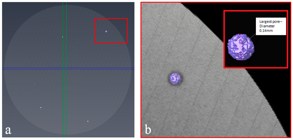 Images of (a) 3D volume render and (b) the largest porosity feature in the EBM disc using VG studio.