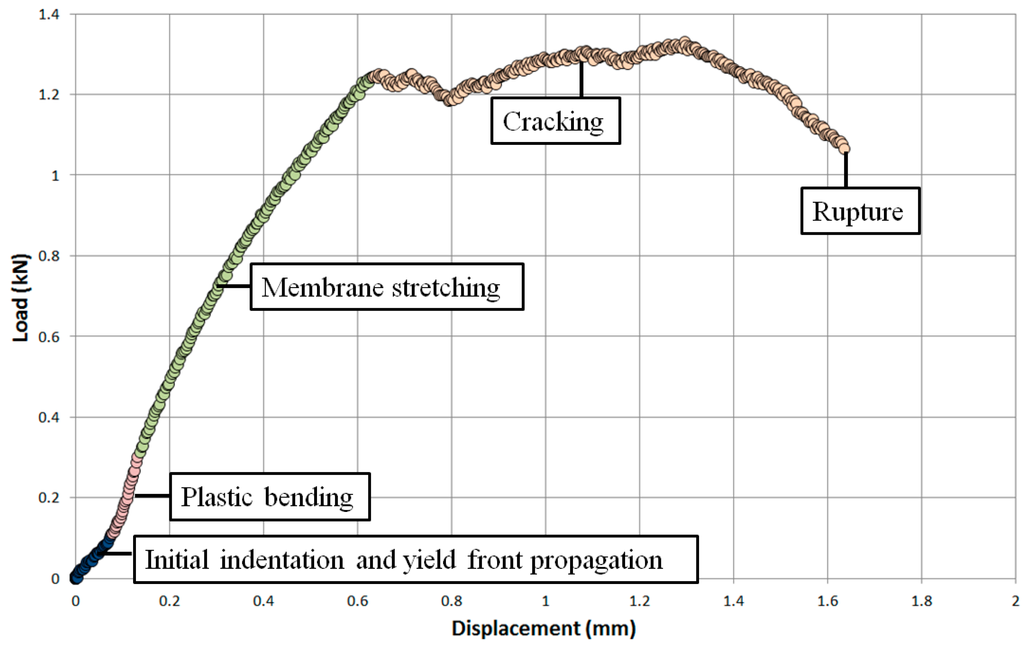 Figure 9 shows the typical small punch load-displacement curve obtained for the cast and HIP material at a temperature of 20 °C and displacement rate of 1.2 mm·min−1. The response for this material is consistent to the behaviour previously published in the literature [15], where the initial region of the curve demonstrates a small period of initial indentation and compression upon loading of the punch, which is quickly followed by material yield. As the miniature disc specimen plastically deforms under the applied load, the material experiences an extended phase of plastic bending and membrane stretching. The material then achieves the first load peak and from thereafter, the disc begins to gradually thin and crack, leading to the onset of rupture. For each small punch tensile test described throughout this research, the displacement at the onset of failure is defined as the punch displacement at 20% load drop after the maximum load, in accordance with the CoP [16]. Each of the stages of deformation are highlighted in Figure 9.