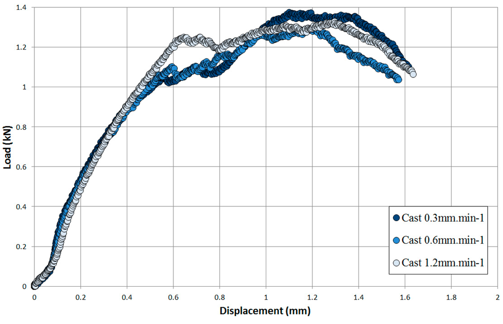 In order to determine whether the rate of displacement had an influence on the deformation behaviour of Ti-6Al-4V, a series of SP tensile tests were performed on the cast and HIP material under a variety of displacement rates. The CoP [16] recommends a displacement rate between 0.2 mm·min−1 and 2 mm·min−1 to ensure a level of consistency for data generation. As such, the displacement rates of 0.3 mm·min−1, 0.6 mm·min−1 and 1.2 mm·min−1 were employed for this research. Figure 10 illustrates that the rate of displacement appears to have minimal effect in the early stages of deformation. For each rate, the periods of initial indentation, yield front propagation and membrane stretching are highly comparable. However, as each test approaches the first load peak, a clear discrepancy in response develops as the test performed at the fastest rate (1.2 mm·min−1) achieves the highest load, thus giving the stiffest response, followed by the 0.6 mm·min−1 and 0.3 mm·min−1 tests respectively. These results are in agreement with the trends observed in more conventional mechanical test approaches where a series of uniaxial tensile tests on Ti-6Al-4V performed under different strain rates found that the yield stress and ultimate tensile strength (UTS) of the material increase with a faster strain rate [26]. After this load peak, the final stages of deformation are less uniform as each of the discs start to crack in a more uncontrolled nature until final rupture occurs.