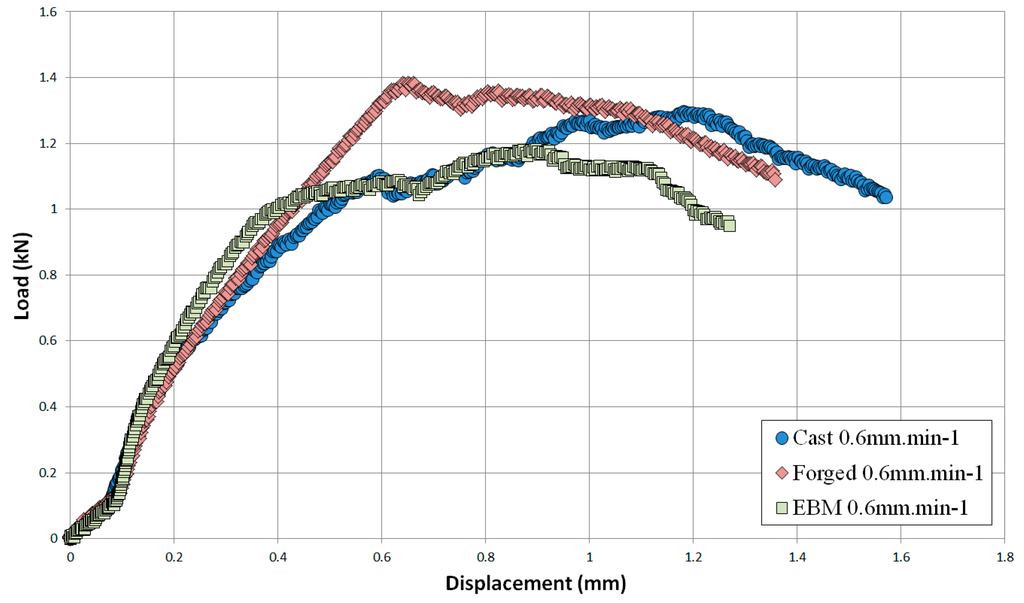 SP tensile tests were then performed on each of the Ti-6Al-4V variants to directly compare their respective tensile responses. A consistent displacement rate of 0.6 mm·min−1 and test temperature of 20 °C was employed for each experiment and the load-displacement results are presented in Figure 11. The figure shows that the cast and HIP and EBM discs have a similar response during the initial loading stage to the point where membrane stretching begins. The forged material however appears to accumulate a higher proportion of load over this period indicating that this variant exhibits a stiffer response. This could be attributed to the reduced grain size of the forged material when compared to the other variants (as previously stated in Table 1) and this follows the expected trend as proposed by Hall-Petch. As the first load peak is then approached, the forged material achieves the highest load (1.4 kN), whereas the cast and HIP and EBM specimens have a similar response, reaching an initial peak load of around 1.1 kN after 0.55 mm of displacement. From this stage, each of the material variants start to undergo cracking and it can be seen that the ultimate peak load of the EBM material does not appear to significantly increase from the initial peak. This is consistent with the behaviour of the forged material which is unable to reach a maximum load in excess of the first, whereas the cast and HIP variant achieves an ultimate load peak which is considerably higher than the first, occurring over a relatively larger level of displacement. In each case, the increased ductility in these two materials is observed in comparison to the EBM counterpart. In the EBM material, it is shown that once cracking commences, at a lower first peak than the forged material, the debit in strength in the material is too great and unrecoverable for the disc to manage a second load peak in excess of the first, unlike the cast and HIP material, and thus fails under a lower level of overall displacement along with a lower ultimate load.