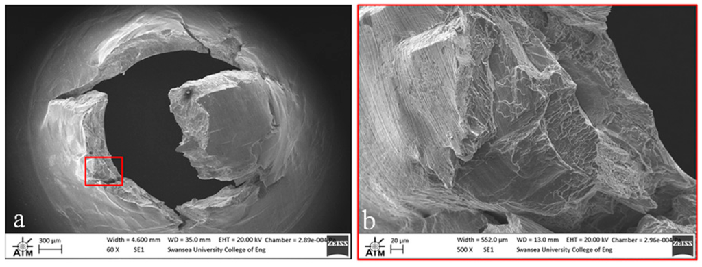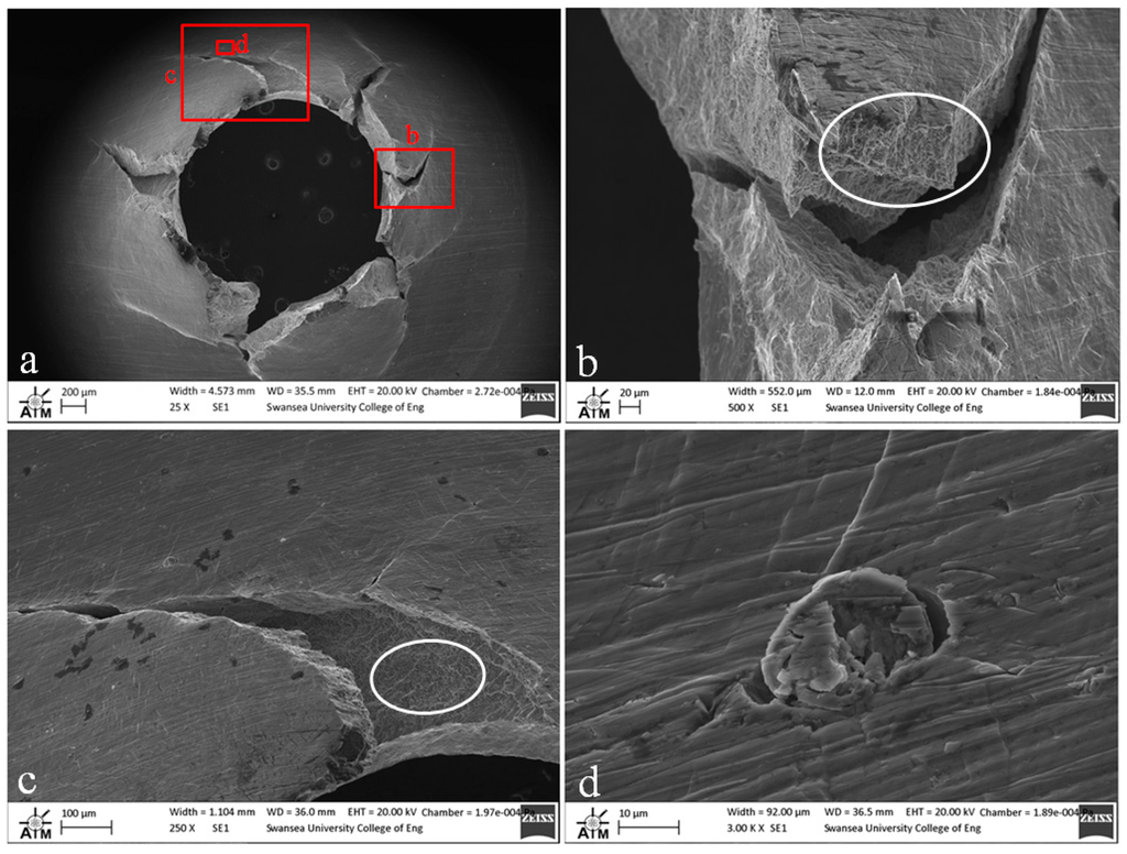 In contrast, the fracture appearance of the EBM disc is more consistent with the behaviour that would be expected for a more brittle type material. This is illustrated in Figure 14a, where the number of dominant radial cracks has increased and the specimen appears to have failed in a more transgranular type fashion as highlighted by the relative smoothness of the fracture surface as the crack path travels through a number of grains (Figure 14b). The fracture surface is not entirely devoid of ductile features however, as highlighted by the white circles in Figure 14b,c. The images show a quasi-cleavage type fracture with some presence of ductile dimple tearing and a distinct number of fine and deeper dimples can be seen on the surface. This behaviour is similar to uniaxial results presented in the literature on EBM material [30] where deformation typically exhibits a mixed mode of ductile and brittle fracture. Other contributing factors to such behaviour are given in Figure 14c,d, which appears to indicate the separation along a plane that is parallel to the layers (Figure 14c) and what is likely to be a partially sintered powder particle (Figure 14d), two features that could have an influence on the performance and integrity of an additive material, depending on the application.