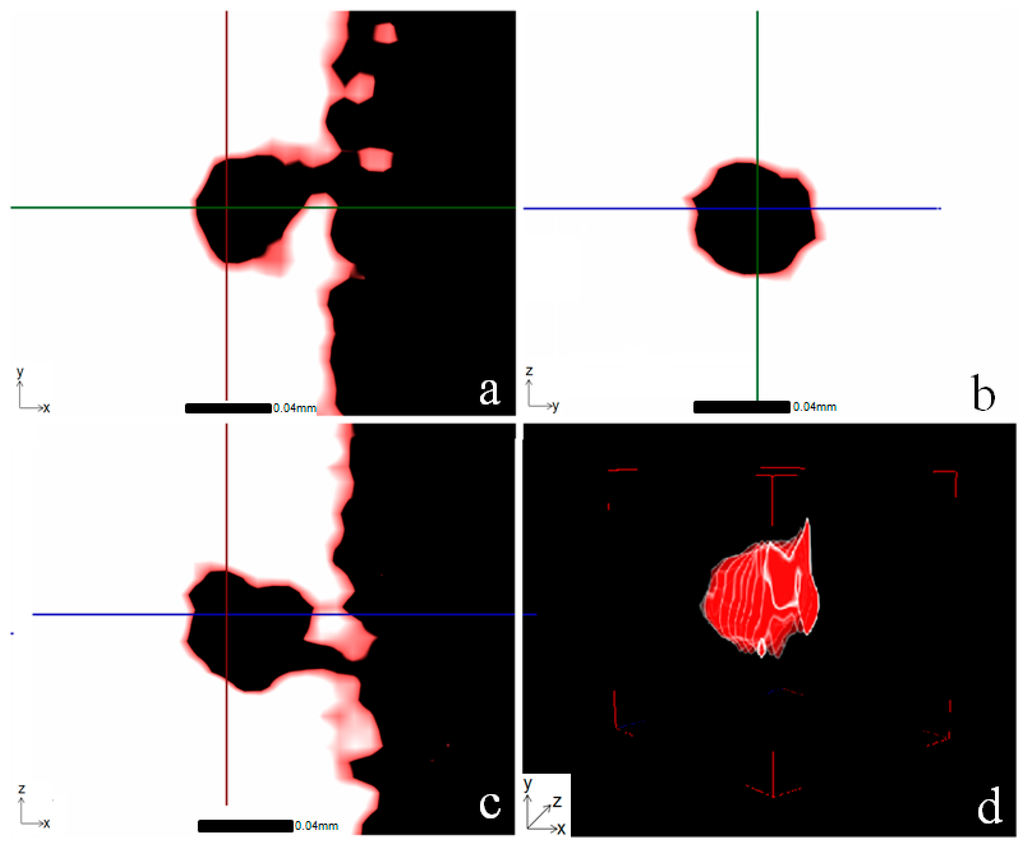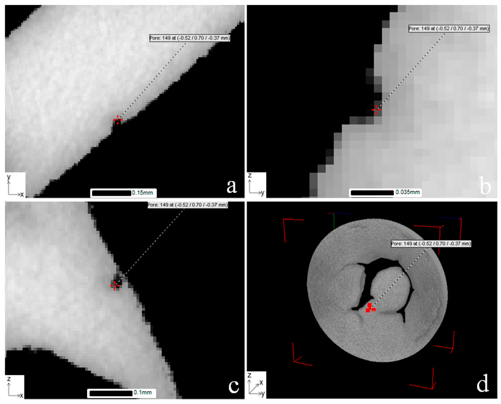 VG Studio representation of a surface breaching pore within the bulk material of the fractured EBM sample in (a) z direction; (b) x direction; (c) y direction and (d) 3D volume render of the isolated deformation region.