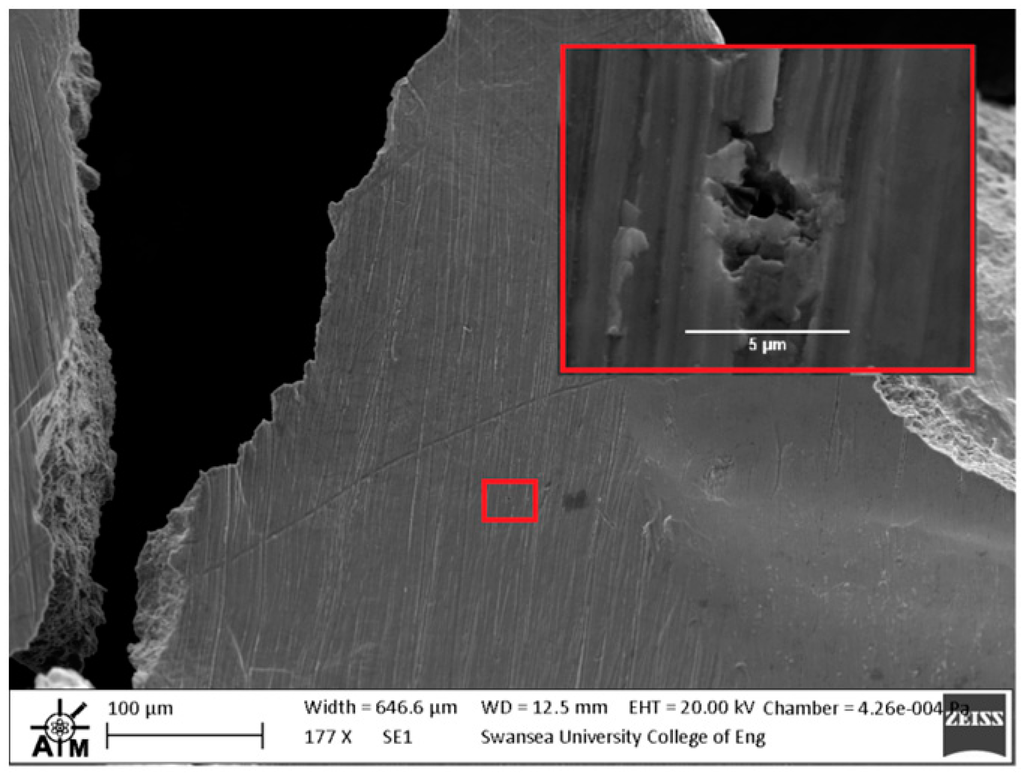 The third pore of interest detected within the bulk of the material from the pre-test scan data, measured at around 35 µm within the expected deformation field (as highlighted by the green circle in Figure 6) could not be identified from the CT data. Due to the size and location it was considered to be the easiest to locate and therefore it is considered that it may have in fact been incorporated into the fracture surface. Nevertheless, no evidence of its presence could be found using CT and SEM post-test, potentially due to the depth and nature of the crack.