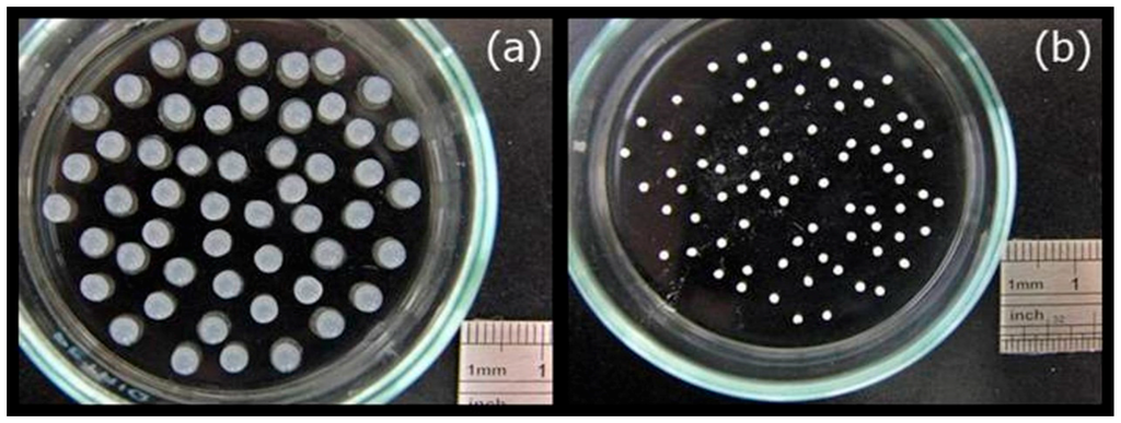 Optical images of (a) MBGNF/alginate gel beads and (b) MFBs.
