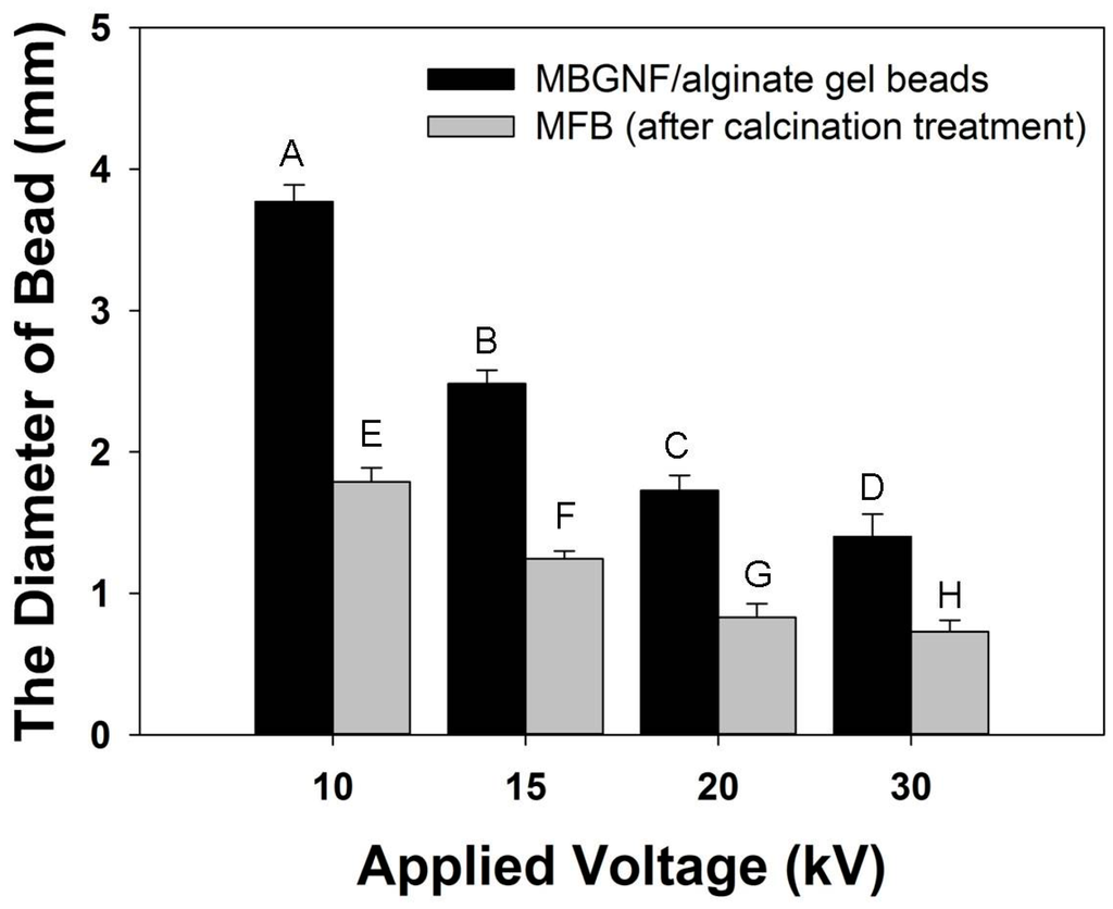 The diameter of MBGNF/alginate gel beads and MFBs as a function of the voltage magnitude. The data are presented as mean ± standard deviation, n = 50. The different letters represent significance at p < 0.05, as determined by the one-way ANOVA with Tukey’s post hoc test.