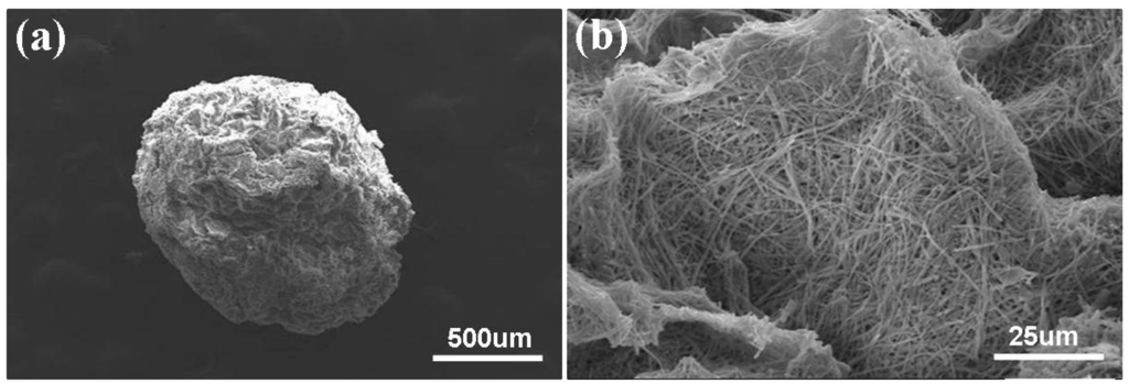 SEM images of a MFB surface in different magnifications (a) ×50, scale bar = 500 μm and (b) ×1000, scale bar = 25 μm.