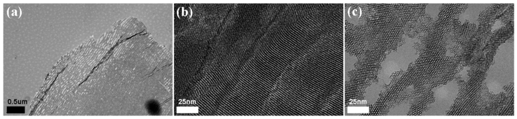 TEM micrograph of the ultramicrotomed MFB embedded in resin. The microstructure of the MFB retained (a) a nanofibrous structure; (b) long one-dimensional channels; and (c) a highly ordered 2D hexagonal structure. The magnification of (a) ×10 k, scale bar = 0.5 μm; (b,c) ×250 k, scale bar = 25 nm.