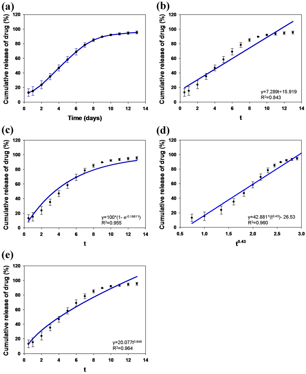 (a) In vitro cumulative tetracycline (TC) release from TC-loaded MFB. Curve was fitted with an equation of (b) zero-order; (c) first-order; (d) Fickian matrix diffusion; (e) Ritger-Peppas models.