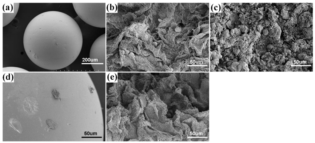 Representative images of the MG63 osteoblast-like cells cultured on microbeads for 1 and 3 d. (a,d) GBs; (b,e) MFBs; (c) MBs; (a–c) 1 day; (d,e) 3 days.