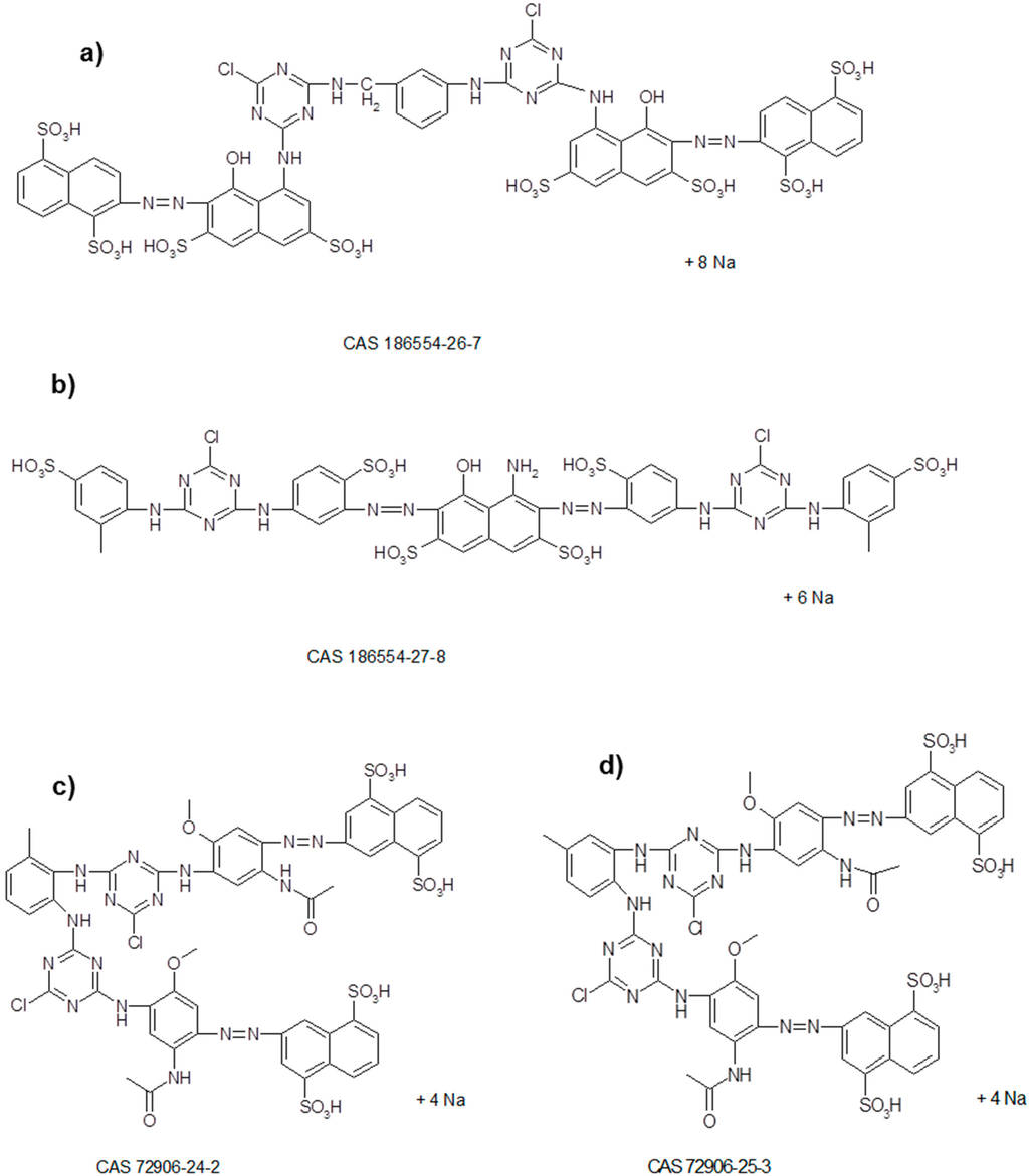 The tri-reactive dye Cibacron Yellow S-3R (CY) was selected for this study. Three reactive dyes were selected for the study of water reuse: Procion Yellow H-EXL (PY), Procion Crimson H-EXL (PC), and Procion Navy H-EXL (PN). All dyes were provided by DyStar (L’Hospitalet de Llobregat, Spain). Figure 1 shows the chemical structures corresponding to PY, PC, and PN. The formula corresponding to CY has not yet been published.