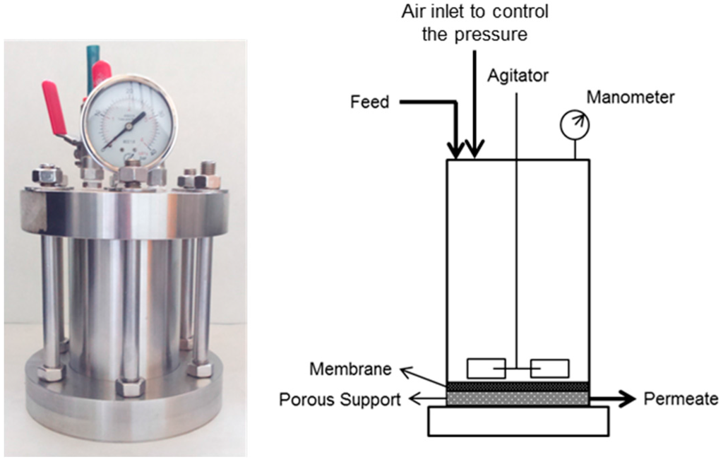 A laboratory pilot plant (V = 0.5 L) manufactured by Polymem Company (Toulouse, France) was used in this work. The pilot plant operated in batch mode at room temperature. The pressure was maintained constant at 8 bars by manually operating a valve. The tests were carried out in dead-end filtration with agitation. The area of the membranes was 0.0064 m2 and it was placed over a plastic porous support. Figure 2 shows the scheme of the membrane pilot plant.