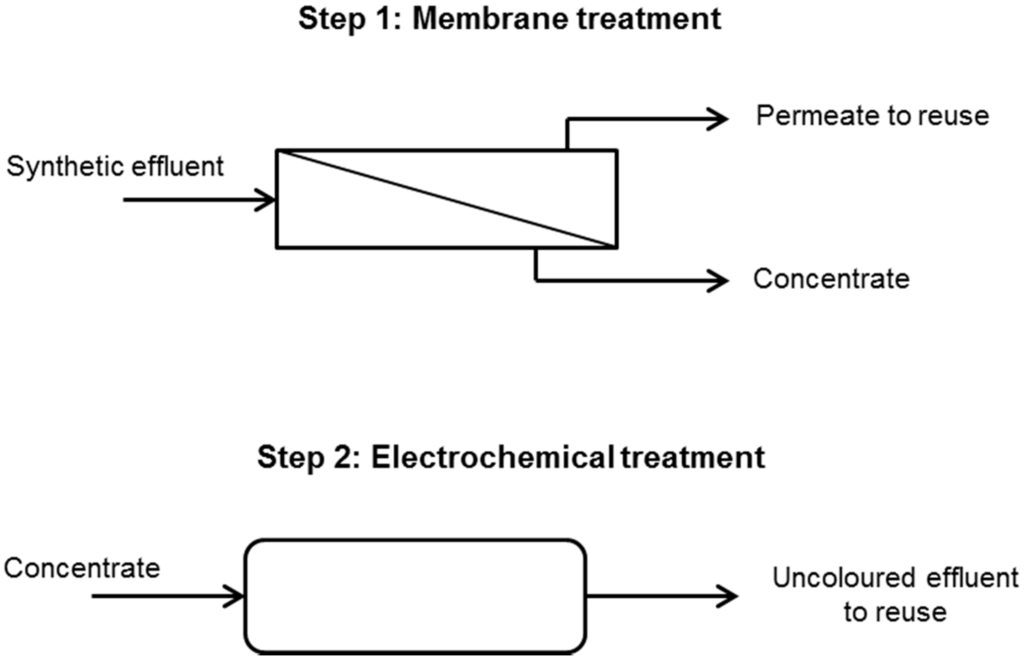 Taking these considerations into account, the aim of this work is to study the feasibility of combining nanofiltration membranes and electrochemical processes to treat textile wastewater containing a tri-reactive dye. For the membrane filtration study, the effect of salt concentration and pH of the effluents was tested. Subsequently, the concentrate obtained in the membrane filtration was decolourised by electrochemical treatment at three current densities. Both permeate and effluent decolourised by electrochemical process were reused in new cotton dyeings. Finally, fabrics dyed with the reused effluent were compared with fabrics dyed with softened tap water.
