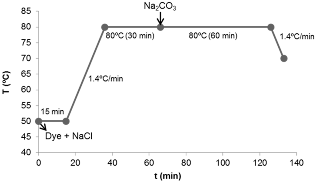 The reuse dyeing tests were performed in a laboratory Ti-Color dyeing machine (Prato, Italy) under the following conditions: 10 g of cotton fabric, dye concentration of 3% o.w.f (over weight of fibre), liquor ratio 1:10 (1 g fibre/0.01 L dye bath), 60 g·L−1 of NaCl, and 16 g·L−1 of Na2CO3. The dyeing procedure is shown in Figure 4.
