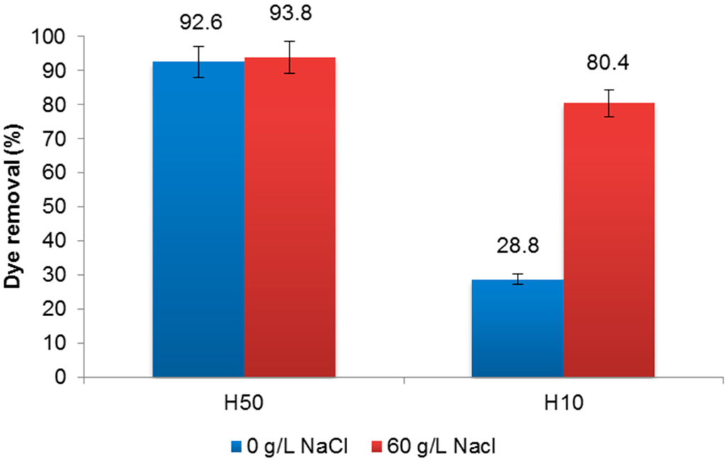 To test the effect of NaCl on dye removal, experiments were carried out without salt and containing 60 g·L−1 of NaCl. According to results showed in Figure 5, the presence of NaCl did not affect the retention of the dye with the H50 membrane. However, in the case of the H10 membrane, a significant increase in dye removal was observed in the presence of salt. A further study may be required to determine if the NaCl increases the affinity between dye and membrane and/or causes agglomerations of dye particles large enough to be retained.