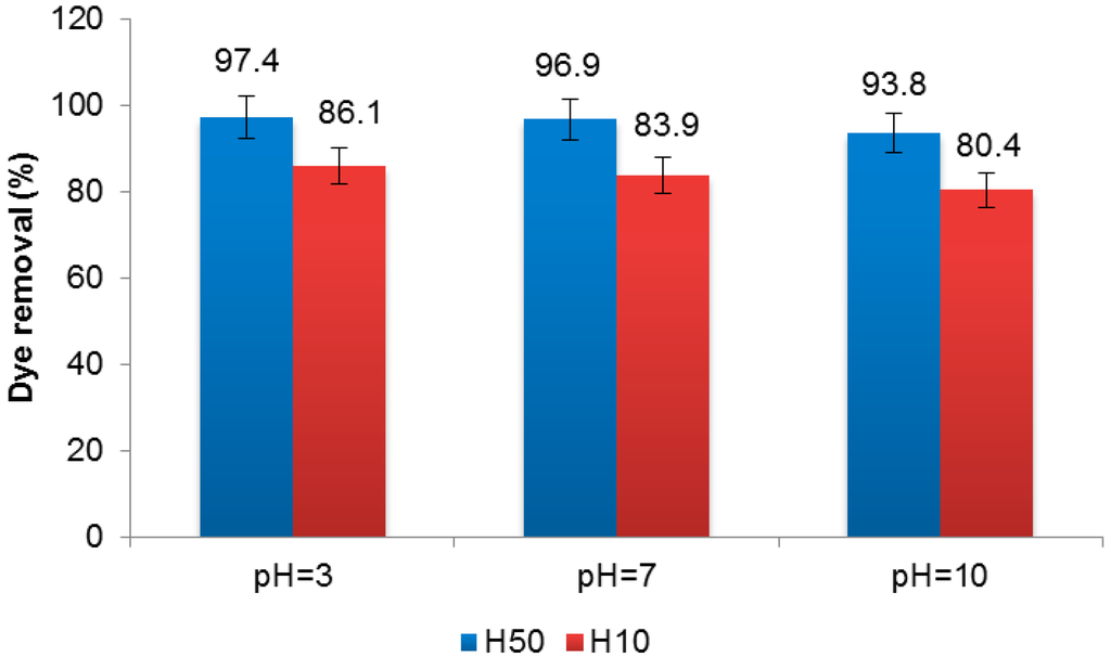 The pH can also affect the physical properties of dye solution. The experiments carried out at different pH values (3, 7, and 10), showed that the nanofiltration is efficient in all studied cases, although the highest efficiency was achieved at pH 3 for both membranes. With H50, 97.4% dye removal was obtained at pH 3 and 94% at pH 10 whereas, with H10, the yield was 86.1% at pH 3 and 80 at pH 10 (Figure 6).