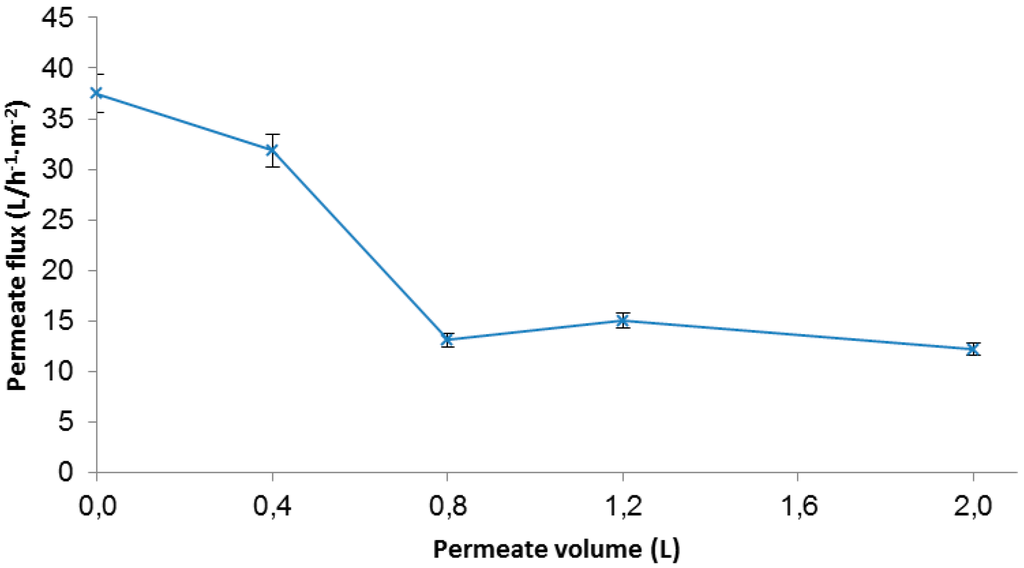 As can be observed in Figure 5, for the first 0.4 L the permeate flux decreased from 38 to 32 L/h−1·m−2. However, from this point, the permeate flux decreased up to 13 L/h−1·m−2, which represents a loss of 65%. Then, the permeability flux remained stable until the end of the experiment. After cleaning the membrane, the permeate flux was 29 L/h−1·m−2 (64.4% of the flux lost was recovered). Therefore, the fouling observed was mostly reversible.