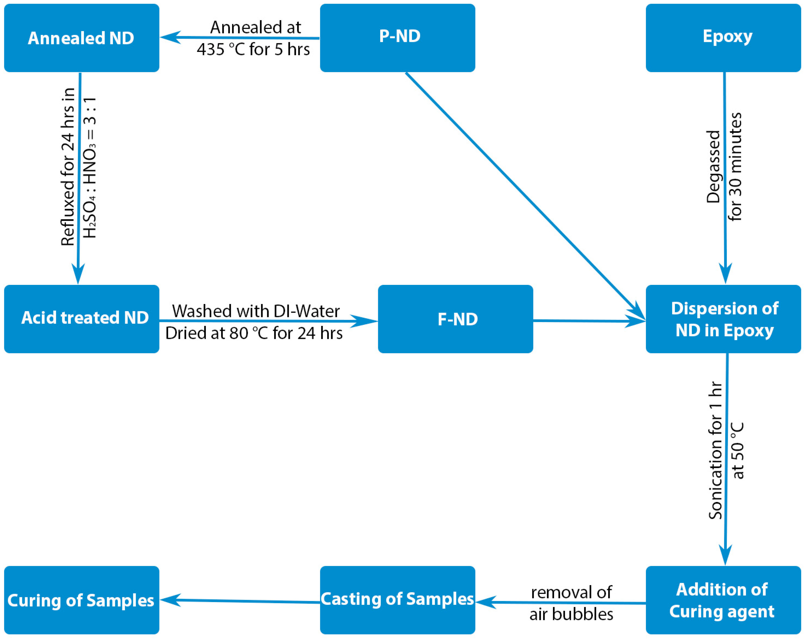 The phase purity of pristine NDs (P-NDs) was about 50% and it was purchased from Henan Union Abrasives Corporation, Zhengzhou, China. As per the supplier’s specifications, the size of the P-ND cluster was less than 500 nm and its color was black. Impurities were removed by annealing the P-ND at 435 °C for 5 h [12,13]. Usually, non-diamond content, i.e., amorphous and graphitic carbon and traces of metals, are considered as impurities [17]. After annealing, P-NDs were treated with a mixture of sulphuric acid (Sinopharm, Shanghai, China) and nitric acid (Sinopharm, Shanghai, China) by using reflex assembly as described elsewhere [18]. During the acid treatment of P-NDs the reflux temperature was kept around 280 °C, followed by continuous stirring for 24 h [11]. NDs were separated from acids mixture by using the centrifuge machine (Analytical Instruments Co., Shanghai, China) and afterwards washed with de-ionized water (Anting Scientific Instrument Factory, Shanghai, China) to neutralize the pH. These washed NDs were termed as functionalized NDs (F-NDs) and in the end were dried at 80 °C for 24 h to get the F-NDs in powder form [11]. Hydroxyl and carboxyl functional groups were attached on the NDs’ surface during the reflux process and the size of F-ND clusters are found to be approximately around 100 nm [11]. The P-ND and F-ND powders were characterized by X-ray diffraction (XRD), Fourier transform infrared (FTIR) spectroscopy, and X-ray photoelectron spectroscopy (XPS). XRD was done on Philips X’Pert Pro Super X-ray diffractometer (PANalytical, Almelo, The Netherlands) with Cu Kα (λ = 1.54178 Å) radiation source, FTIR spectra were acquired using Thermal Fisher Nicolet 8700 (Thermo Fisher Scientific Inc., Waltham, MA, USA) with a resolution of 0.1 cm−1 while Thermal Fisher ESCALAB250Xi spectrometer (Thermo Fisher Scientific Inc., Waltham, MA, USA) equipped with an Al anode (Al Kα = 1486.7 eV) was used for XPS. The nanocomposites were formed by using P-ND and F-ND as filler while epoxy as a matrix. Commercially purchased epoxy diglycidyl ether of bisphenol-A (DGEBA) (ZhongkKe Scientific, Beijing, China) is used as matrix material while methylhexahydrophthalic anhydride (MHHPA) (ZhongkKe Scientific, Beijing, China) is used as a curing agent. The curing agent to epoxy ratio was 92:100 in grams and this ratio gives the best mechanical properties according to the literature [19]. Predetermined amount of NDs was added to epoxy via sonication for 1 h at 50 °C after degassing the epoxy for 30 min. Temperature-dependent viscosity of epoxy resin helps direct incorporation of NDs. By using mechanical mixing machine (Fluko, Shanghai, China) MHHPA was mixed with the mixture of ND/epoxy for 2 min. Afterwards, the air bubbles inside the mixture were removed by putting it in vacuum for 1 min and then casted into the molds. Standard curing process was used for curing the nanocomposite samples [20]. The schematic of nanocomposite formation is shown in Figure 1. The nanocomposite samples with different concentrations of NDs were prepared and these concentrations are 1, 10, and 20 by weight percent (wt %) of epoxy. The nanocomposite samples were tested according to ASTM D-5045 standard [21] and fracture surfaces were examined by optical microscope and scanning electron microscopy (SEM). Testing, for fracture properties, was done on MTS SANS CMT6503 (MTS, Shanghai, China) with a maximum force of 5 kN at ambient conditions. Optical images were taken on JSZ6D SE2200 microscope (Olympus, Tokyo, Japan) using a 10 W LED lamp and SEM images were taken on JEOL JSM-6700F SEM (JEOL, Tokyo, Japan) at 10 kV.