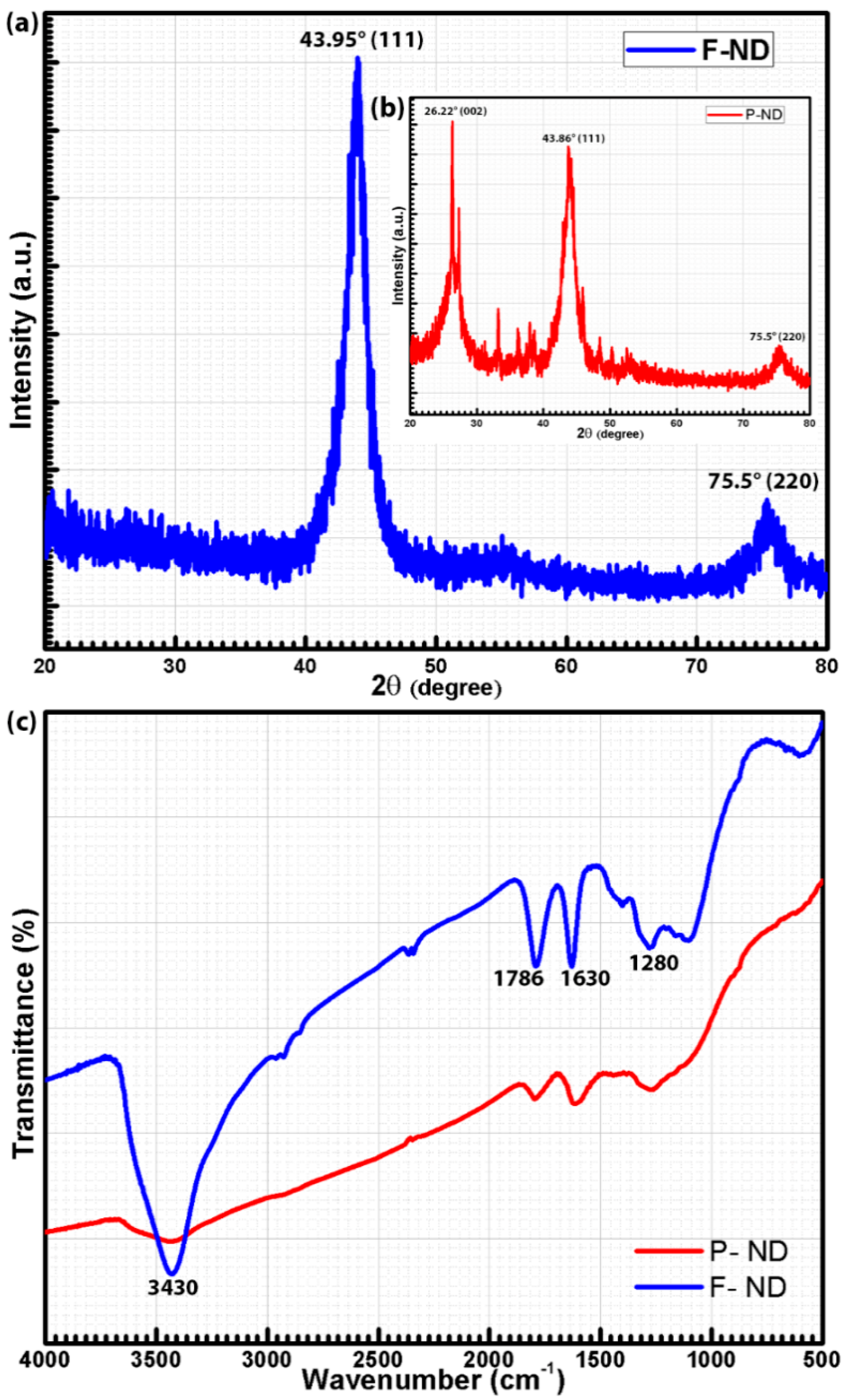 (a) XRD pattern of F-NDs and (b) P-NDs; (c) comparison of FTIR spectra of P-NDs and F-NDs.