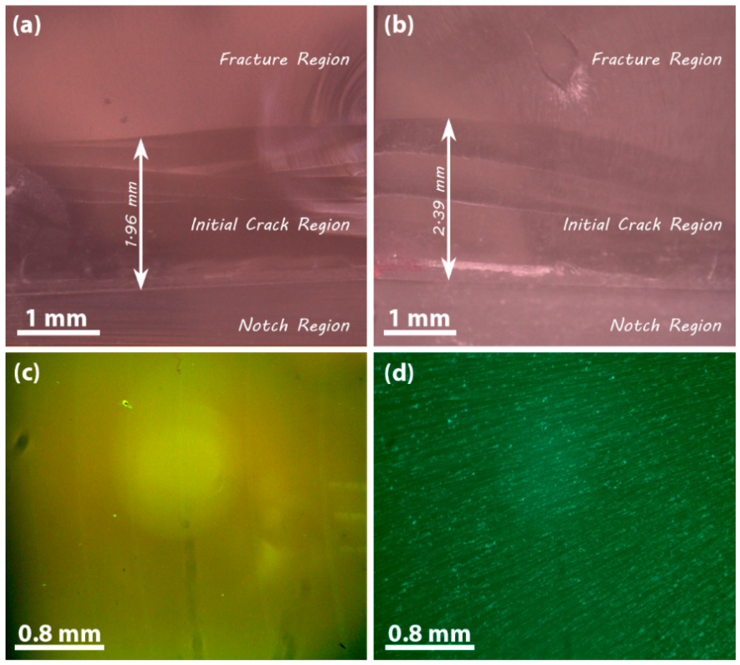 Optical images of (a) neat epoxy and (b) 10 wt % F-ND/epoxy nanocomposite in dark field to mark the initial crack region and fracture region (direction of crack propagation is from bottom to top); the fracture surfaces of (c) neat epoxy and (d) 10 wt % F-ND/epoxy nanocomposite in bright field.