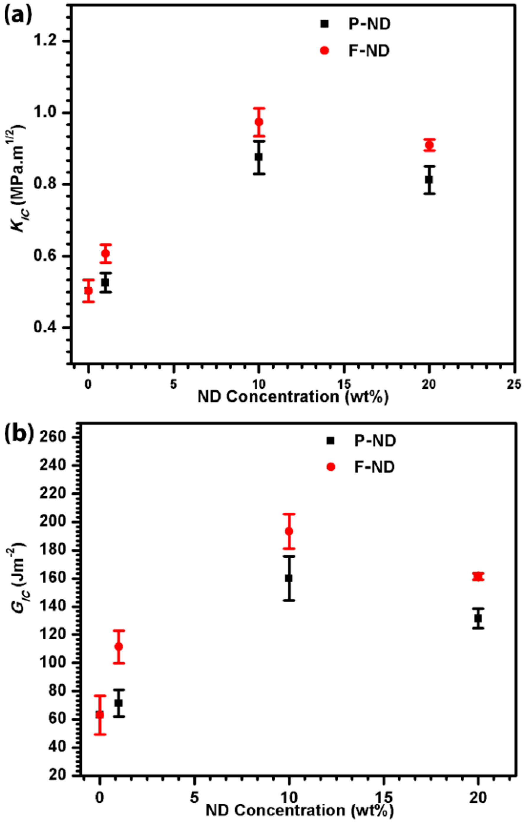 In summary, the fracture toughness and fracture energy properties of ND/epoxy nanocomposites are analyzed. A two-fold increase in fracture toughness and a three-fold increase in fracture energy are observed. It is found that F-NDs are a better choice for nanocomposite formation because of the functional groups on their surface. F-ND/epoxy nanocomposites exhibit a rougher surface than that of P-ND/epoxy nanocomposites which indicates the presence of a strong interface. At high concentrations, interfaces overlap by making a web and this web of interfaces stops further crack propagation. In the case of P-ND/epoxy nanocomposites, debonding happened at the interface and plastic voids or semi-naked particles are observed, while debonding for F-ND/epoxy nanocomposites happened within the epoxy molecular network. Strong interface as well as debonding within the epoxy molecular network at high concentrations may lead to subsequent cracks, parallel to the parent crack, via crack splitting, which results in a fiber-like structure on the fracture surface. The plastic void growth, crack deflection and subsequent crack growth are correlated with higher values of fracture toughness and fracture energy.