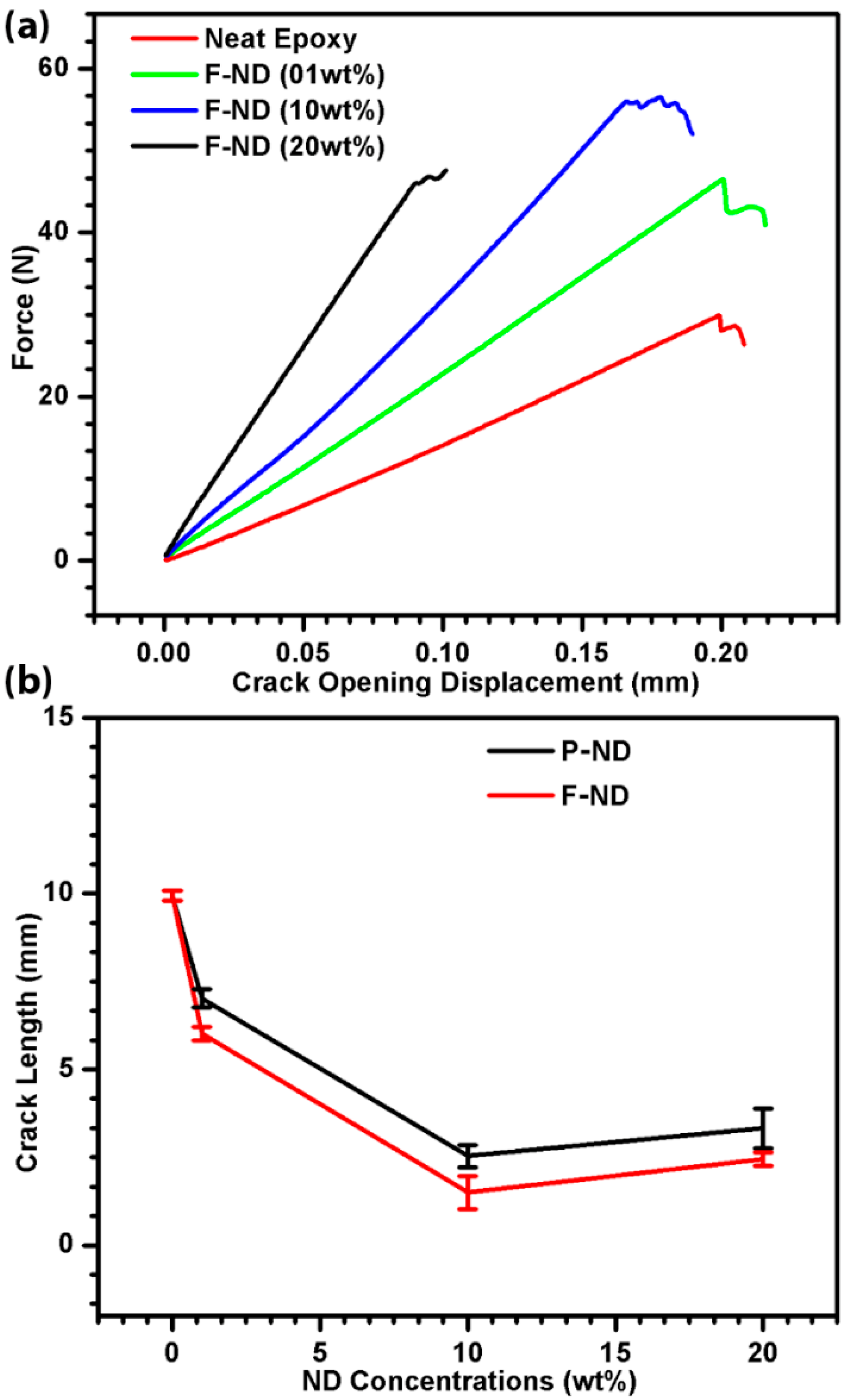 Comparison of (a) force-crack opening displacement curves and (b) crack lengths of 0, 1, 10, and 20 wt % F-ND/epoxy nanocomposites.
