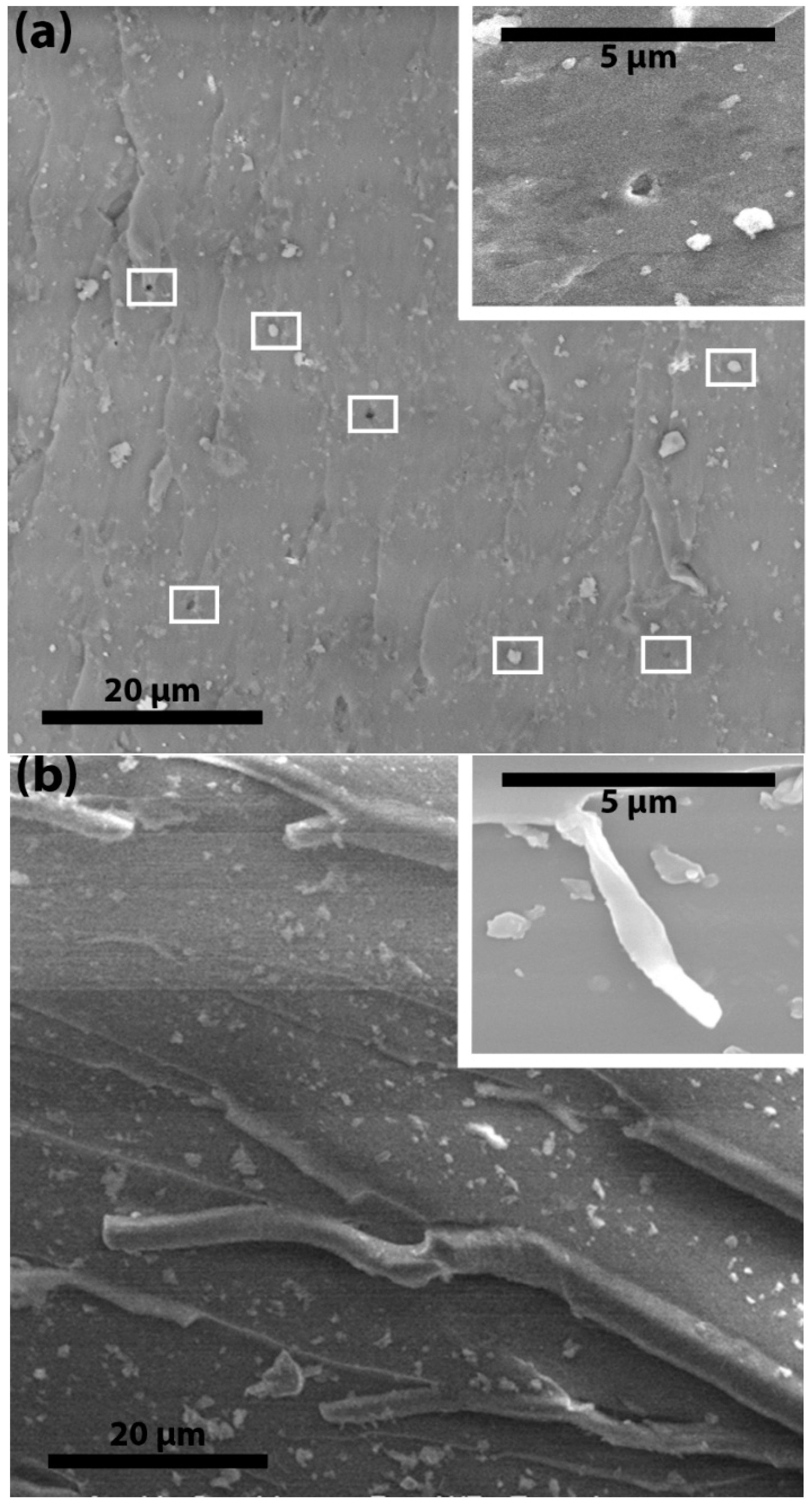 Figure 8a shows that the fracture surfaces of P-ND/epoxy nanocomposites have some cavities and semi-naked ND particles (marked by small white rectangles). These cavities or plastic voids were produced because of debonding between the ND particles and the epoxy molecular network. Debonding and plastic void growth are an indication of a weak interface. A weak interface cannot transfer stress from the epoxy network to the ND particles and this failure leads to breakage at the interface. Due to breakage at the interface, particles pull out from the surface and cavities or plastic voids are produced. Sometimes, plastic voids are produced on the opposite surface and semi-naked particles can be seen on the surface under observation. The ratio of the size of the particle cluster and the plastic void gives more information about the debonding. If the plastic void is bigger than the average particle cluster then it indicates debonding within the epoxy network. However, no plastic voids bigger than the average particle cluster are observed in the P-ND/epoxy nanocomposites. On the other side, no plastic voids or semi-naked ND particles are observed in the F-ND/epoxy nanocomposites (see Figure 7b), indicating the strong interface. Sometimes, because of the strong interface, debonding does not occur at the interface but it happens within the epoxy molecular network. Instead of plastic voids, small fibers of epoxy are observed in the F-ND/epoxy nanocomposites, as shown in Figure 8b. Notably, these fiber-like structures clearly indicate that debonding occurred within the epoxy molecular network instead of at the interface by creating a subsequent crack. This subsequent crack travels parallel to the parent crack.